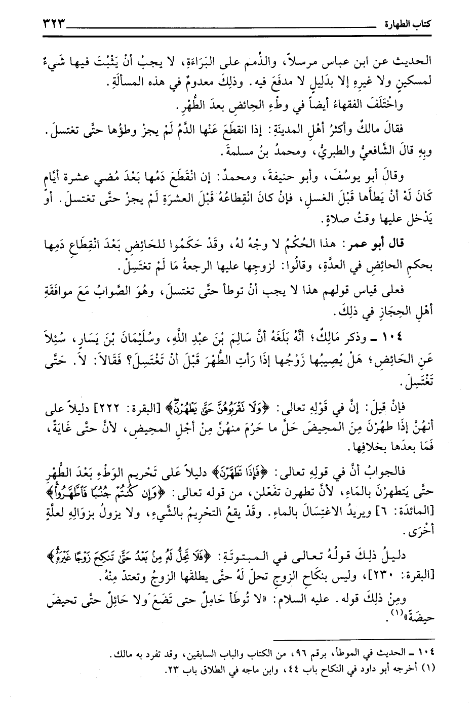 104 - وَذَكَرَ مَالِكٌ أَنَّهُ بَلَغَهُ أَنَّ سَالِمَ بْنَ عَبْدِ اللَّهِ وَسُلَيْمَانَ بْنَ يَسَارٍ سُئِلَا عَنِ الْحَائِضِ هَلْ يُصِيبُهَا زَوْجُهَا إِذَا رَأَتِ الطُّهْرَ قَبْلَ أَنْ تَغْتَسِلَ فَقَالَا لَا حَتَّى تَغْتَسِلَ
