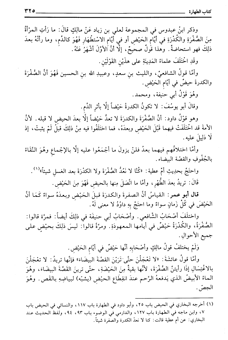 قَالَ أَبُو عُمَرَ الْقِيَاسُ أَنَّ الصُّفْرَةَ وَالْكُدْرَةَ قَبْلَ الْحَيْضِ وَبَعْدَهُ سَوَاءٌ كَمَا أَنَّ الْحَيْضَ فِي كُلِّ زَمَانٍ سَوَاءٌ وَمَا احْتَجَّ بِهِ دَاوُدُ لَا مَعْنَى لَهُ