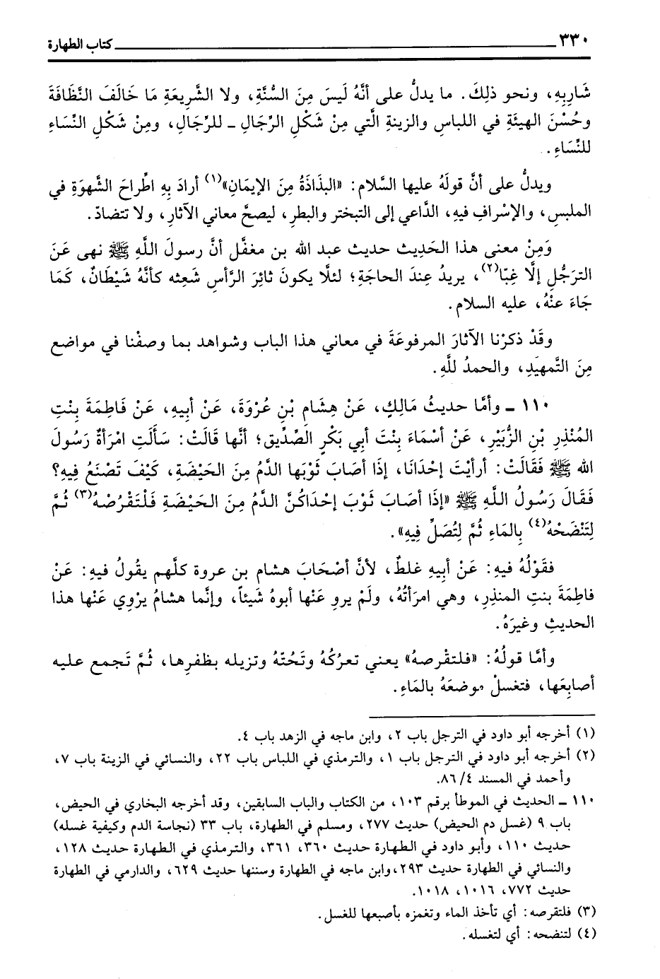 110 - وَأَمَّا حَدِيثُ مَالِكٍ عَنْ هِشَامِ بْنِ عُرْوَةَ عَنْ أَبِيهِ عن فَاطِمَةَ بِنْتِ الْمُنْذِرِ بْنِ الزُّبَيْرِ عَنْ أَسْمَاءَ بِنْتِ أَبِي بَكْرٍ الصَّدِيقِ أَنَّهَا قَالَتْ سَأَلَتِ امْرَأَةٌ رَسُولَ اللَّهِ صَلَّى اللَّهُ عَلَيْهِ وَسَلَّمَ فَقَالَتْ أَرَأَيْتَ إِحْدَانَا إِذَا أَصَابَ ثَوْبَهَا الدَّمُ مِنَ الْحَيْضَةِ كَيْفَ تَصْنَعُ فِيهِ فَقَالَ رَسُولُ اللَّهِ صَلَّى اللَّهُ عَلَيْهِ وَسَلَّمَ ((إِذَا أَصَابَ ثَوْبَ إِحْدَاكُنَّ الدَّمُ مِنَ الْحَيْضَةِ فَلْتَقْرُصْهُ (3) ثُمَّ لِتَنَضَحْهُ بِالْمَاءِ ثُمَّ لِتُصَلِّ فِيهِ))