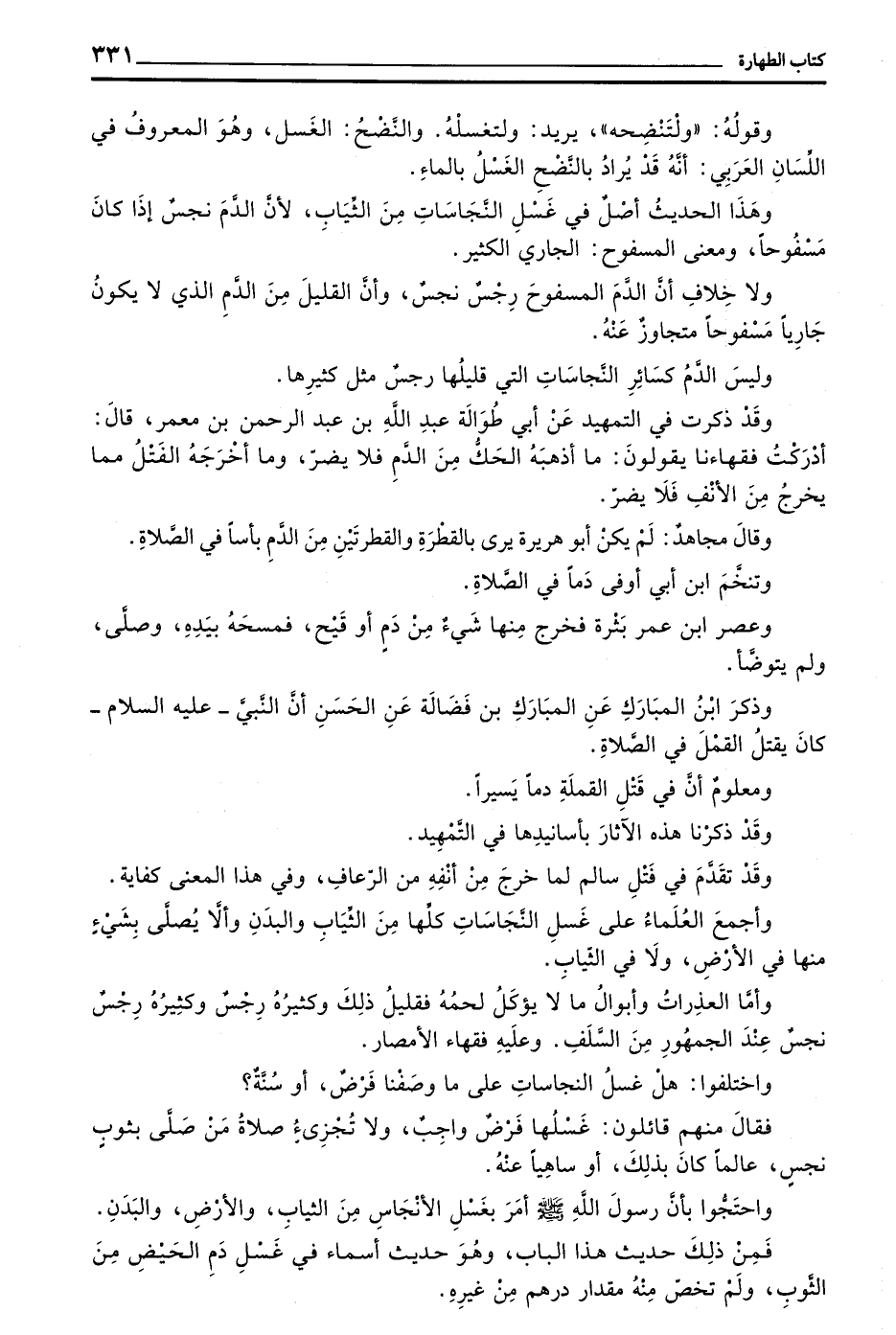وَقَدْ ذَكَرْتُ فِي التَّمْهِيدِ عَنْ أَبِي طُوَالَةَ عَبْدِ اللَّهِ بْنِ عَبْدِ الرَّحْمَنِ بْنِ مَعْمَرٍ قَالَ أَدْرَكْتُ فُقَهَاءَنَا يَقُولُونَ مَا أَذْهَبَهُ الْحَكُّ مِنَ الدم فلا يضر وأما أَخْرَجَهُ الْفَتْلُ مِمَّا يَخْرُجُ مِنَ الْأَنْفِ فَلَا يَضُرُّ