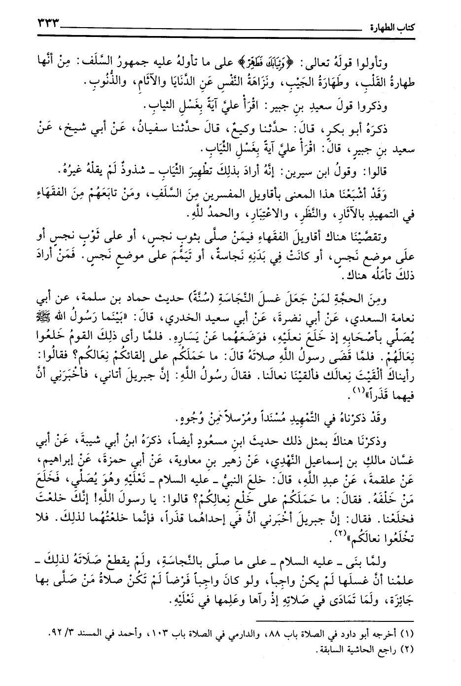 وَمِنَ الْحُجَّةِ لِمَنْ جَعَلَ غَسْلَ النَّجَاسَةِ (سُنَّةً) حَدِيثُ حَمَّادِ بْنِ سَلَمَةَ عَنْ أَبِي نَعَامَةَ السَّعْدِيِّ عَنْ أَبِي نَضْرَةَ عَنْ أَبِي سَعِيدٍ الْخُدْرِيِّ قَالَ ((بَيْنَمَا رَسُولُ اللَّهِ صَلَّى اللَّهُ عَلَيْهِ وَسَلَّمَ يصلي بِأَصْحَابِهِ إِذْ خَلَعَ نَعْلَيْهِ فَوَضَعَهُمَا عَنْ يَسَارِهِ فَلَمَّا رَأَى ذَلِكَ الْقَوْمُ خَلَعُوا نِعَالَهُمْ فَلَمَّا قَضَى رَسُولُ اللَّهِ صَلَاتَهُ قَالَ مَا حَمَلَكُمْ عَلَى إِلْقَائِكُمْ نِعَالَكُمْ فَقَالُوا رَأَيْنَاكَ أَلْقَيْتَ نِعَالَكَ فَأَلْقَيْنَا نِعَالَنَا فَقَالَ رَسُولُ اللَّهِ إِنَّ جِبْرِيلَ أَتَانِي فَأَخْبَرَنِي أَنَّ فِيهِمَا قَذَرًا))