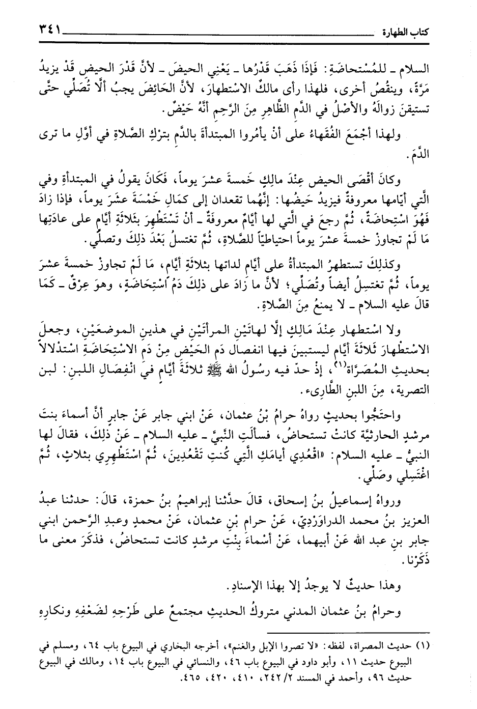 السَّلَامُ - لِلْمُسْتَحَاضَةِ فَإِذَا ذَهَبَ قَدْرُهَا - يَعْنِي الْحَيْضَ - لِأَنَّ قَدْرَ الْحَيْضِ قَدْ يَزِيدُ مَرَّةً وَيَنْقُصُ أُخْرَى فَلِهَذَا رَأَى مَالِكٌ الِاسْتِطْهَارَ لِأَنَّ الْحَائِضَ يَجِبُ أَلَّا تُصَلِّيَ حَتَّى تَسْتَيْقِنَ زَوَالَهُ وَالْأَصْلُ فِي الدَّمِ الظَّاهِرِ مِنَ الرَّحِمِ أَنَّهُ حَيْضٌ
