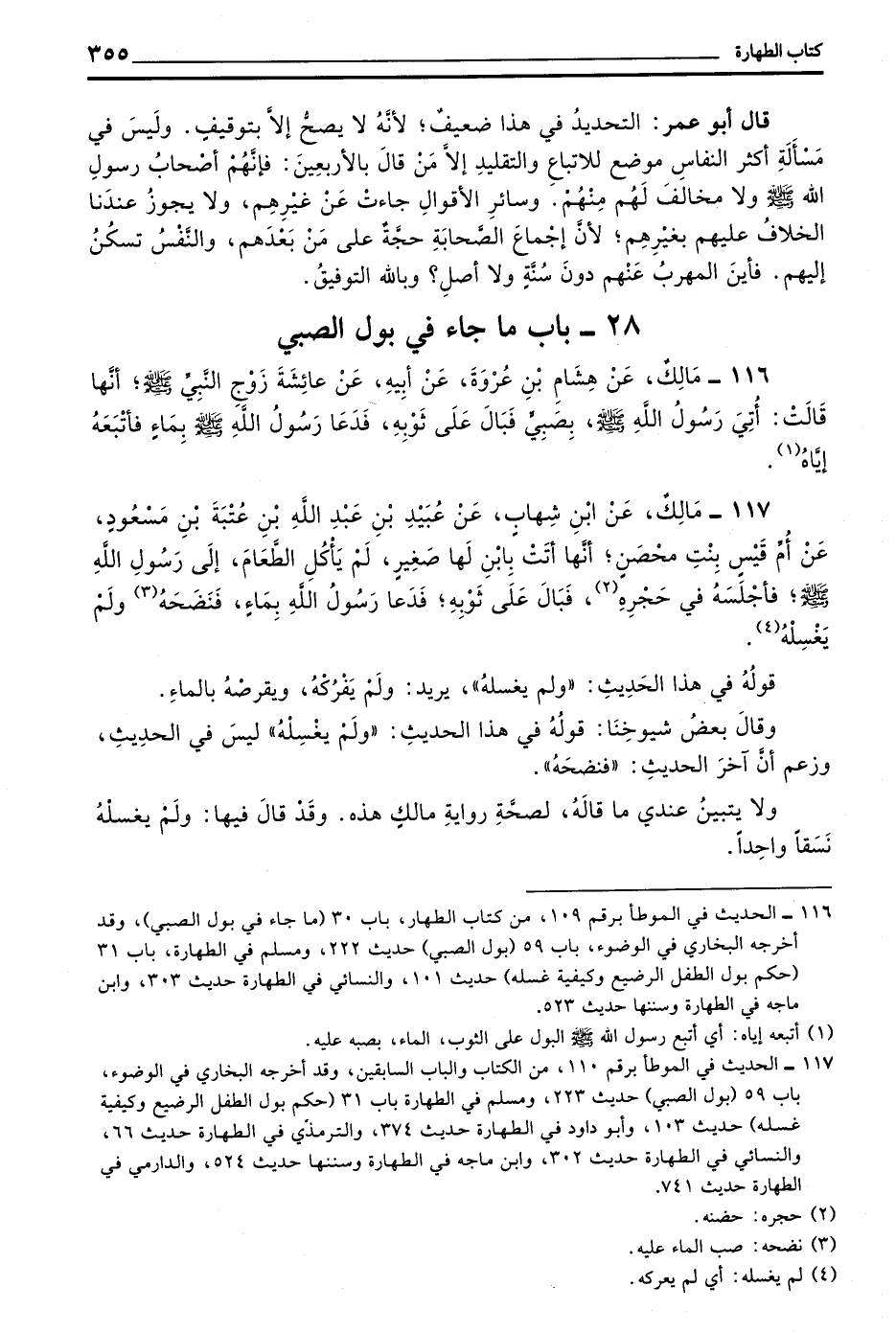 116 - مَالِكٌ عَنْ هِشَامِ بْنِ عُرْوَةَ عَنْ أَبِيهِ عَنْ عَائِشَةَ زَوْجِ النَّبِيِّ صَلَّى اللَّهُ عَلَيْهِ وَسَلَّمَ أَنَّهَا قَالَتْ أُتِيَ رَسُولُ اللَّهِ صَلَّى اللَّهُ عَلَيْهِ وَسَلَّمَ بِصَبِيٍّ فَبَالَ عَلَى ثَوْبِهِ فَدَعَا رَسُولُ اللَّهِ صَلَّى اللَّهُ عَلَيْهِ وَسَلَّمَ بِمَاءٍ فَأَتْبَعَهُ إِيَّاهُ