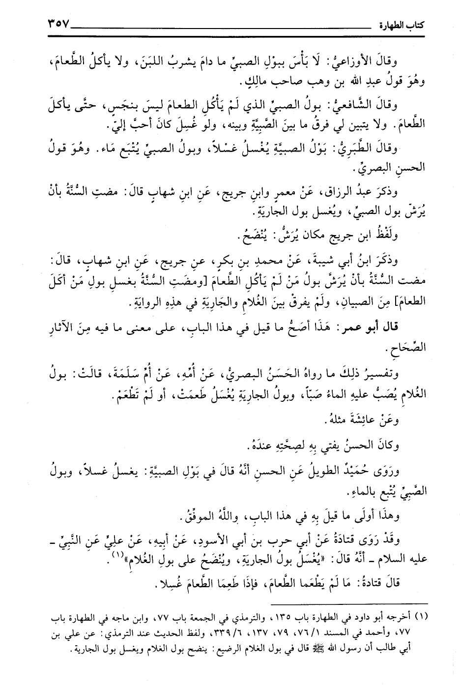 وَرَوَى حُمَيْدٌ الطَّوِيلُ عَنِ الْحَسَنِ أَنَّهُ قَالَ فِي بَوْلِ الصَّبِيَّةِ يُغْسَلُ غَسْلًا وبول الصبي يتبع بالماء
