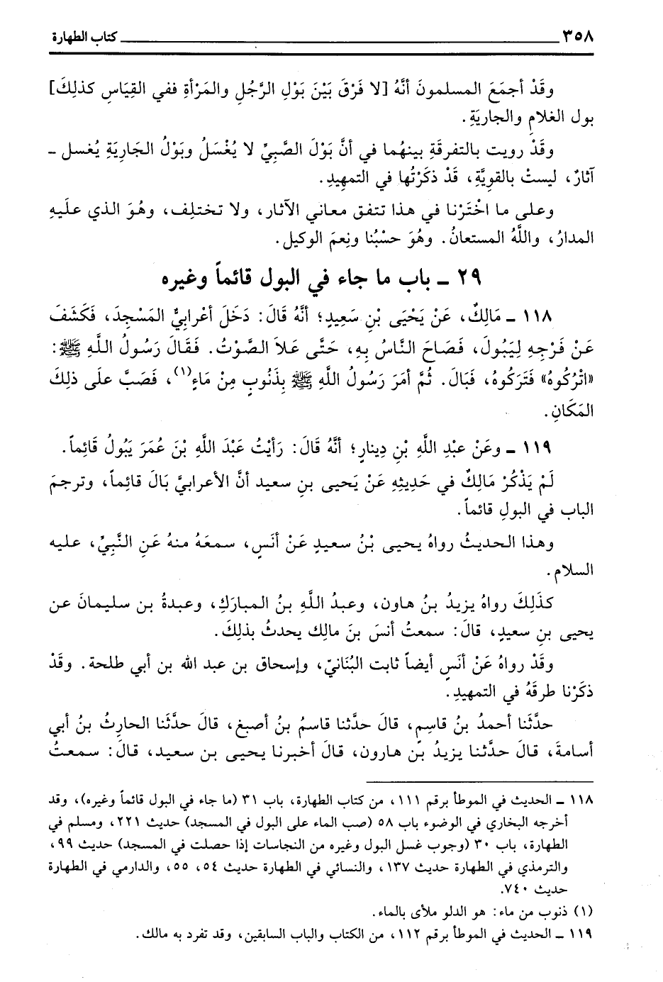 118 - مَالِكٌ عَنْ يَحْيَى بْنِ سَعِيدٍ أَنَّهُ قَالَ دَخَلَ أَعْرَابِيٌّ الْمَسْجِدَ فَكَشَفَ عَنْ فَرْجِهِ لِيَبُولَ فَصَاحَ النَّاسُ بِهِ حَتَّى عَلَا الصَّوْتُ فَقَالَ رَسُولُ اللَّهِ صَلَّى اللَّهُ عَلَيْهِ وَسَلَّمَ ((اتْرُكُوهُ فَتَرَكُوهُ فَبَالَ ثُمَّ أَمَرَ رَسُولُ اللَّهِ صَلَّى اللَّهُ عَلَيْهِ وَسَلَّمَ بِذَنُوبٍ مِنْ مَاءٍ (1) فَصَبَّ عَلَى ذَلِكَ الْمَكَانِ