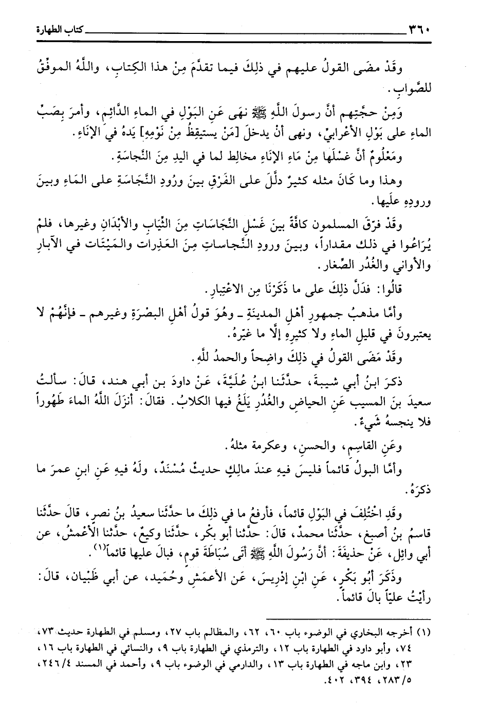 وَقَدِ اخْتُلِفَ فِي الْبَوْلِ قَائِمًا فَأَرْفَعُ مَا فِي ذَلِكَ مَا حَدَّثَنَا سَعِيدُ بْنُ نَصْرٍ قَالَ حَدَّثَنَا قَاسِمُ بْنُ أَصْبَغَ حَدَّثَنَا مُحَمَّدٌ قَالَ حَدَّثَنَا أَبُو بَكْرٍ حَدَّثَنَا وَكِيعٌ حَدَّثَنَا الْأَعْمَشُ عَنْ أَبِي وَائِلٍ عَنْ حُذَيْفَةَ أَنَّ رَسُولَ اللَّهِ صَلَّى اللَّهُ عَلَيْهِ وَسَلَّمَ أَتَى سُبَاطَةَ قَوْمٍ فَبَالَ عَلَيْهَا قائما