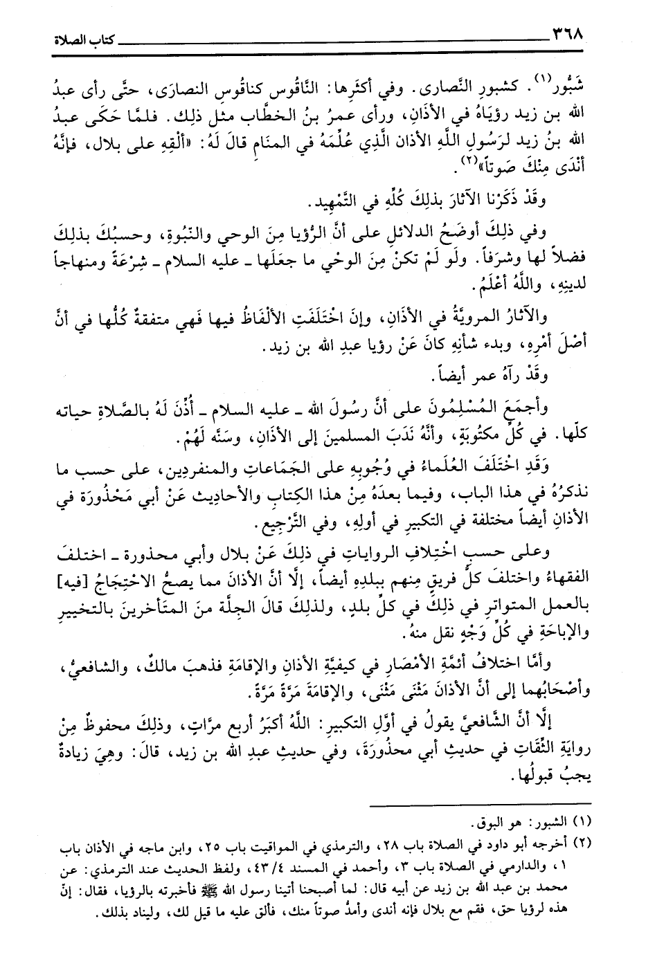 شبور كشبور النصارى وفي أكثرها الناقوس كَنَاقُوسِ النَّصَارَى حَتَّى رَأَى عَبْدُ اللَّهِ بْنُ زَيْدٍ رُؤْيَاهُ فِي الْأَذَانِ وَرَأَى عُمَرُ بْنُ الْخَطَّابِ مِثْلَ ذَلِكَ فَلَمَّا حَكَى عَبْدُ اللَّهِ بن زيد لرسول الله الْأَذَانَ الَّذِي عُلِّمَهُ فِي الْمَنَامِ قَالَ لَهُ ((أَلْقِهِ عَلَى بِلَالٍ فَإِنَّهُ أَنْدَى مِنْكَ صَوْتًا))