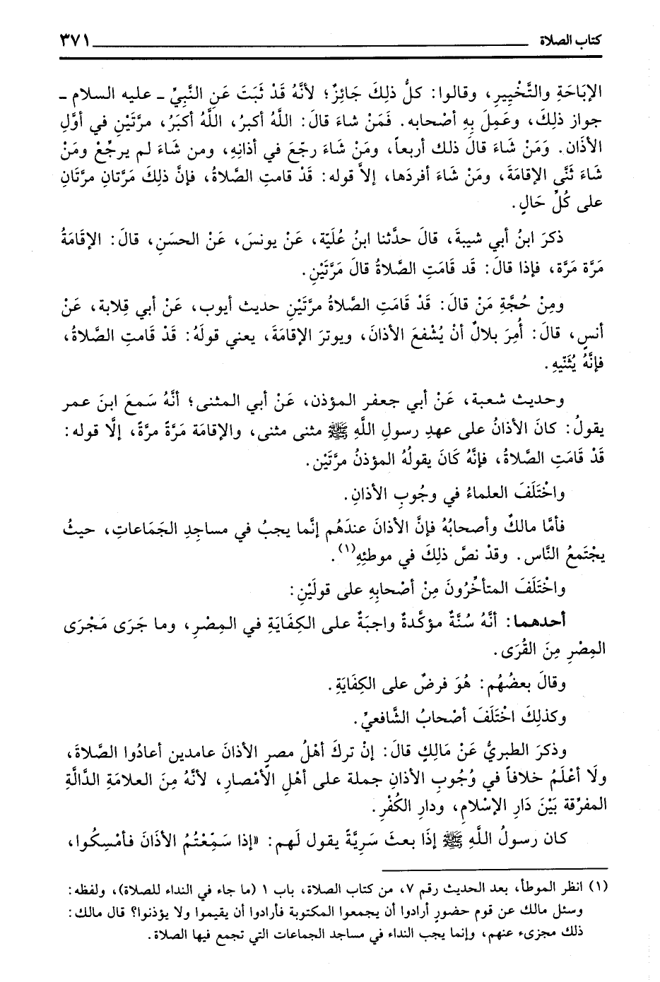 وَذَكَرَ الطَّبَرِيُّ عَنْ مَالِكٍ قَالَ إِنْ تَرَكَ أَهْلُ مِصْرٍ الْأَذَانَ عَامِدِينَ أَعَادُوا الصَّلَاةَ وَلَا أَعْلَمُ خِلَافًا فِي وُجُوبِ الْأَذَانِ جُمْلَةً عَلَى أَهْلِ الْأَمْصَارِ لِأَنَّهُ مِنَ الْعَلَامَةِ الدَّالَّةِ الْمُفَرِّقَةِ بَيْنَ دَارِ الْإِسْلَامِ وَدَارِ الْكُفْرِ