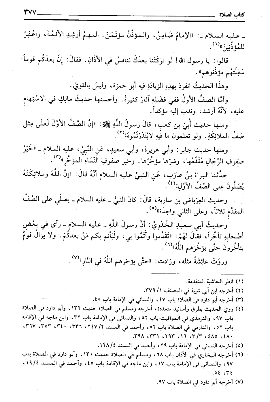 وَمِنْهَا حَدِيثُ أُبَيِّ بْنِ كَعْبٍ قَالَ رَسُولُ اللَّهِ صَلَّى اللَّهُ عَلَيْهِ وَسَلَّمَ ((إِنَّ الصَّفَّ الْأَوَّلَ لَعَلَى مِثْلِ صَفِّ الْمَلَائِكَةِ وَلَوْ تَعْلَمُونَ مَا فِيهِ لَابْتَدَرْتُمُوهُ))