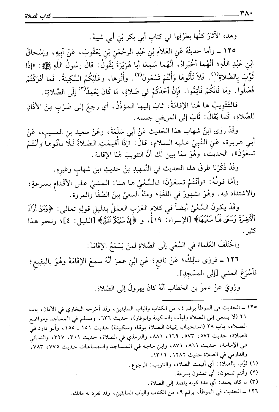 126 - فَرَوَى مالك عن نافع عن بن عُمَرَ أَنَّهُ سَمِعَ الْإِقَامَةَ وَهُوَ بِالْبَقِيعِ فَأَسْرَعَ الْمَشْيَ إِلَى الْمَسْجِدِ