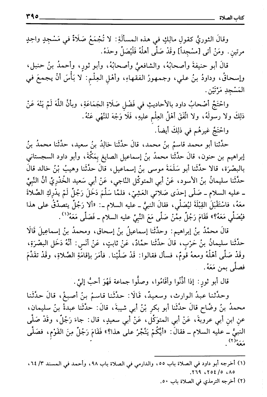 حَدَّثَنَا أَبُو مُحَمَّدٍ قَاسِمُ بْنُ مُحَمَّدٍ قَالَ حَدَّثَنَا خَالِدُ بْنُ سَعِيدٍ حَدَّثَنَا مُحَمَّدُ بن إبراهيم بن حنون قَالَ حَدَّثَنَا مُحَمَّدُ بْنُ إِسْمَاعِيلَ الصَّايِغُ بِمَكَّةَ وَأَبُو دَاوُدَ السِّجِسْتَانِيُّ بِالْبَصْرَةِ قَالَا حَدَّثَنَا أَبُو سَلَمَةَ مُوسَى بْنُ إِسْمَاعِيلَ قَالَ حَدَّثَنَا وُهَيْبُ بْنُ خَالِدٍ قَالَ حَدَّثَنَا سُلَيْمَانُ بْنُ الْأَسْوَدِ عَنْ أَبِي الْمُتَوَكِّلِ النَّاجِي عَنْ أَبِي سَعِيدٍ الْخُدْرِيِّ أَنَّ النَّبِيَّ - عَلَيْهِ السَّلَامُ - صَلَّى إِحْدَى صَلَاتَيِ الْعَشِيِّ فَلَمَّا سَلَّمَ دَخَلَ رَجُلٌ لَمْ يُدْرِكِ الصَّلَاةَ مَعَهُ فَاسْتَقْبَلَ الْقِبْلَةَ لِيُصَلِّيَ فَقَالَ النَّبِيُّ - عَلَيْهِ السَّلَامُ - ((أَلَا رَجُلٌ يَتَصَدَّقُ عَلَى هَذَا فَيُصَلِّي مَعَهُ)) فَقَامَ رَجُلٌ مِمَّنْ صَلَّى مَعَ النَّبِيِّ عَلَيْهِ السَّلَامُ - فَصَلَّى مَعَهُ