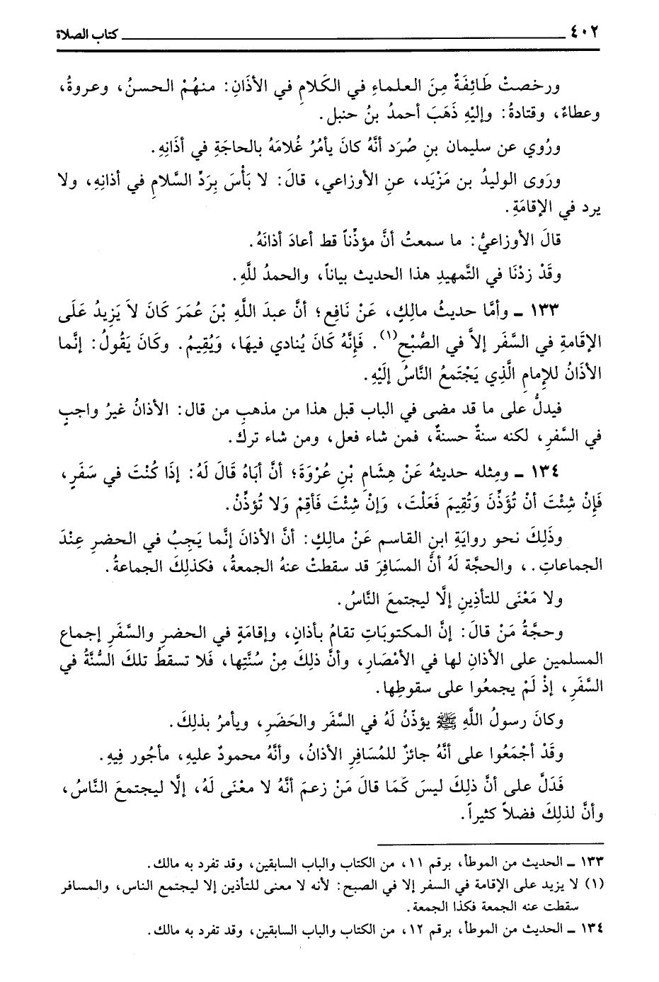 133 - وَأَمَّا حَدِيثُ مَالِكٍ عَنْ نَافِعٍ أَنَّ عَبْدَ اللَّهِ بْنَ عُمَرَ كَانَ لَا يَزِيدُ عَلَى الْإِقَامَةِ فِي السَّفَرِ إِلَّا فِي الصُّبْحِ فَإِنَّهُ كَانَ يُنَادِي فِيهَا وَيُقِيمُ وَكَانَ يَقُولُ إِنَّمَا الْأَذَانُ لِلْإِمَامِ الَّذِي يَجْتَمِعُ النَّاسُ إِلَيْهِ