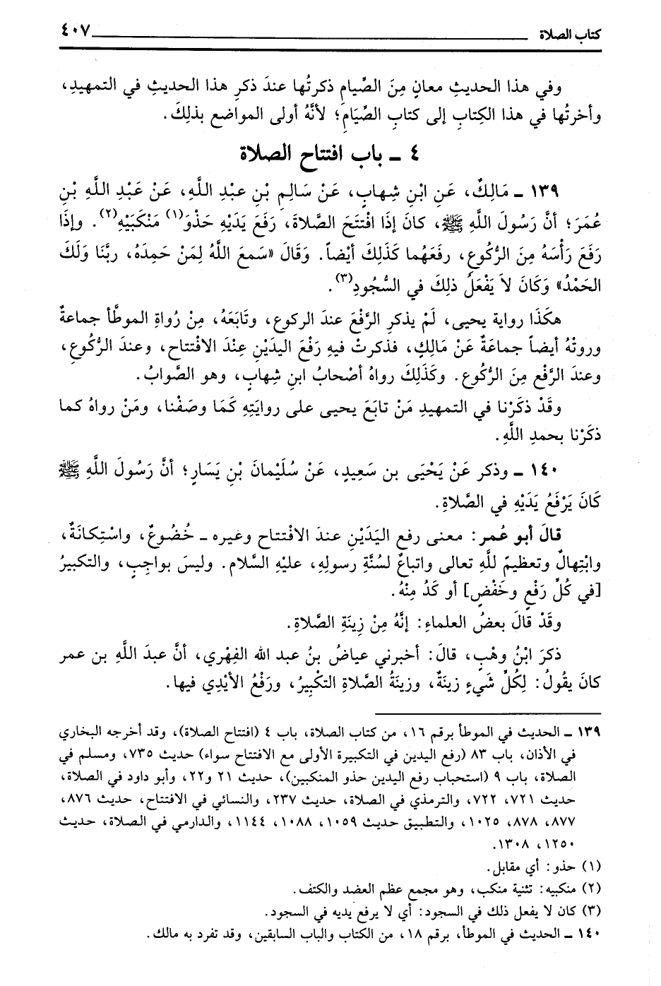 139 - مَالِكٌ عن بن شِهَابٍ عَنْ سَالِمِ بْنِ عَبْدِ اللَّهِ عَنْ عَبْدِ اللَّهِ بْنِ عُمَرَ أَنَّ رَسُولَ اللَّهِ صَلَّى اللَّهُ عَلَيْهِ وَسَلَّمَ كَانَ إِذَا افْتَتَحَ الصَّلَاةَ رَفَعَ يَدَيْهِ حَذْوَ مَنْكِبَيْهِ وَإِذَا رَفَعَ رَأْسَهُ مِنَ الرُّكُوعِ رَفَعَهُمَا كَذَلِكَ أَيْضًا وَقَالَ ((سَمِعَ اللَّهُ لِمَنْ حَمِدَهُ رَبَّنَا وَلَكَ الْحَمْدُ)) وَكَانَ لَا يَفْعَلُ ذَلِكَ فِي السُّجُودِ