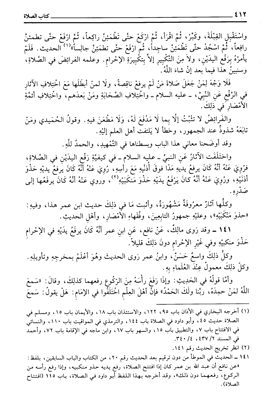 141 - وَقَدْ رَوَى مالك عن نافع عن بن عُمَرَ أَنَّهُ كَانَ يَرْفَعُ يَدَيْهِ فِي الْإِحْرَامِ حَذْوَ مَنْكِبَيْهِ وَفِي غَيْرِ الْإِحْرَامِ دُونَ ذَلِكَ قليلا