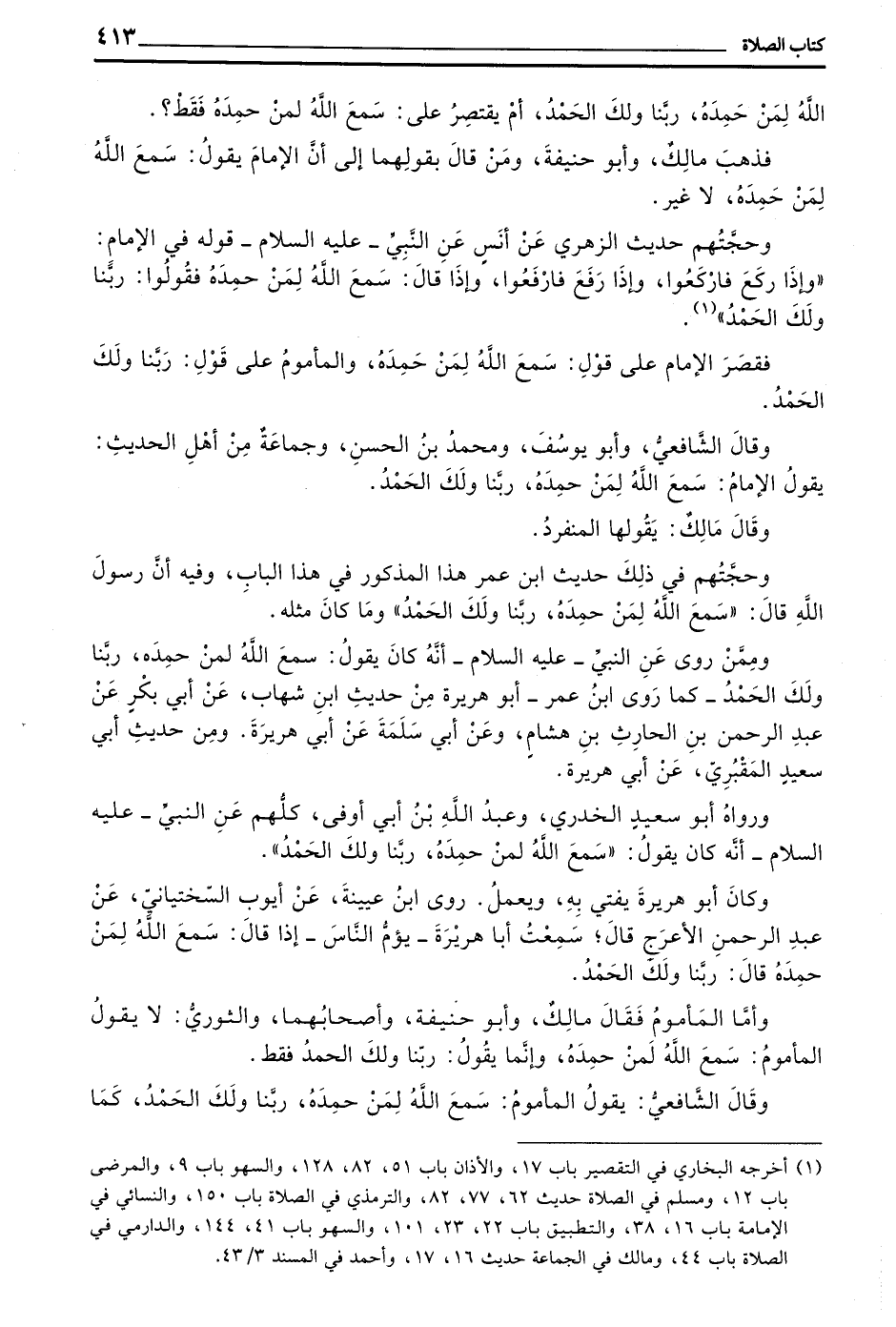 وَقَالَ الشَّافِعِيُّ وَأَبُو يُوسُفَ وَمُحَمَّدُ بْنُ الْحَسَنِ وَجَمَاعَةٌ مِنْ أَهْلِ الْحَدِيثِ يَقُولُ الْإِمَامُ سَمِعَ اللَّهُ لِمَنْ حَمِدَهُ رَبَّنَا وَلَكَ الْحَمْدُ