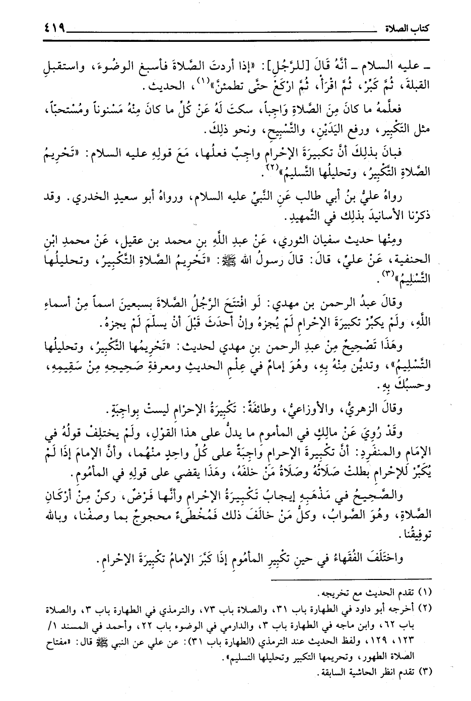وَهَذَا تَصْحِيحٌ مِنْ عَبْدِ الرَّحْمَنِ بْنِ مَهْدِيٍّ لِحَدِيثِ ((تَحْرِيمُهَا التَّكْبِيرُ وَتَحْلِيلُهَا التَّسْلِيمُ)) وَتَدَيُّنٌ مِنْهُ بِهِ وَهُوَ إِمَامٌ فِي عِلْمِ الْحَدِيثِ وَمَعْرِفَةِ صَحِيحِهِ مِنْ سَقِيمِهِ وَحَسْبُكَ بِهِ