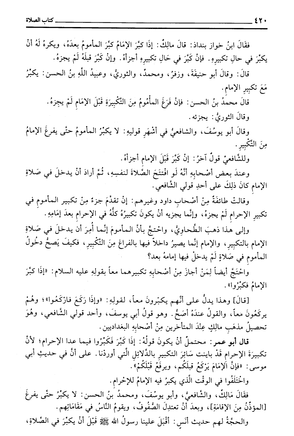 فقال بن خوار بنداذ قَالَ مَالِكٌ إِذَا كَبَّرَ الْإِمَامُ كَبَّرَ الْمَأْمُومُ بَعْدَهُ وَيُكْرَهُ لَهُ أَنْ يُكَبِّرَ فِي حَالِ تَكْبِيرِهِ فَإِنْ كَبَّرَ فِي حَالِ تَكْبِيرِهِ أَجْزَأَهُ وَإِنَّ كَبَّرَ قَبْلَهُ لَمْ يُجْزِهْ