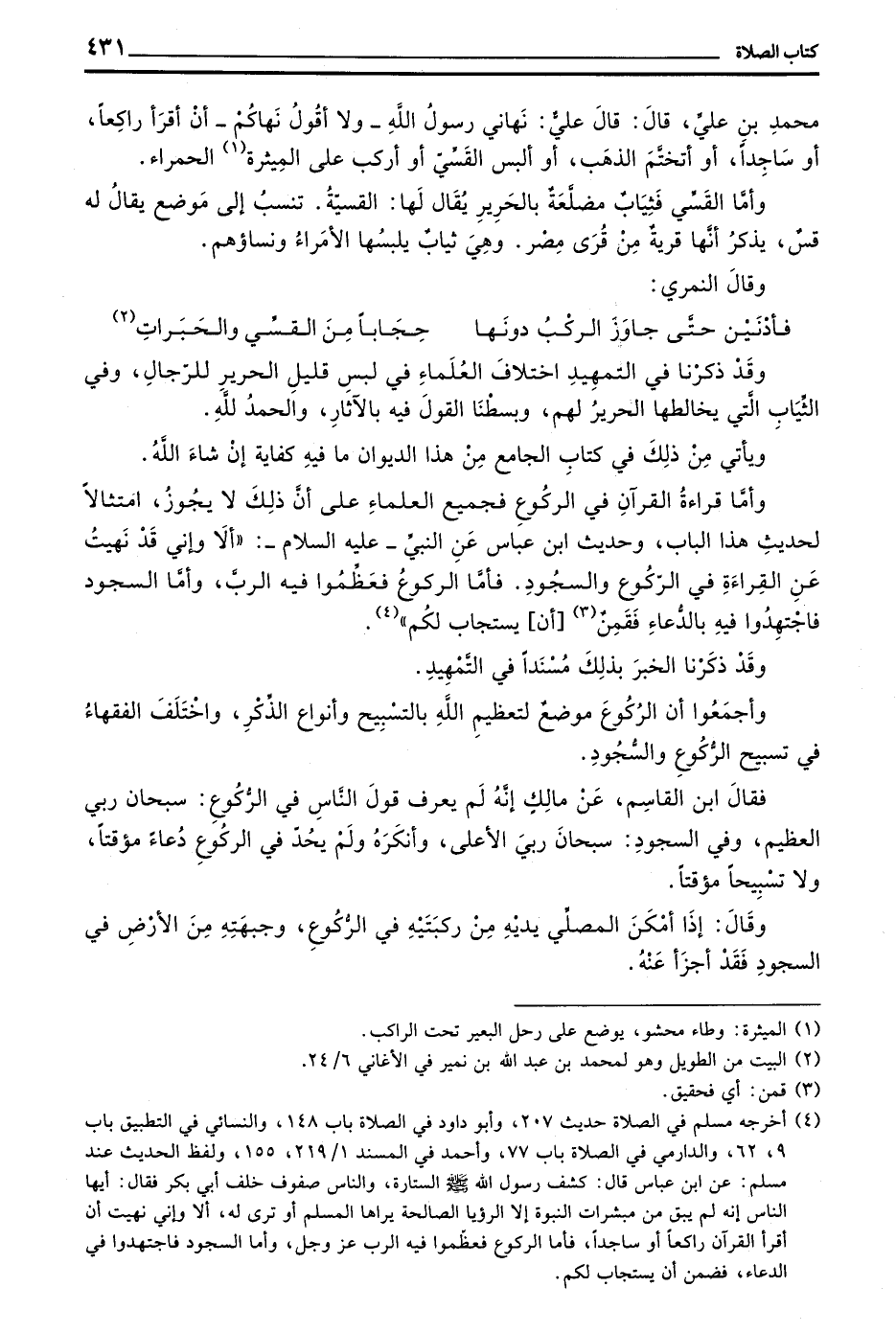 مُحَمَّدِ بْنِ عَلِيٍّ قَالَ قَالَ عَلَيٌّ نَهَانِي رسول الله - وَلَا أَقُولُ نَهَاكُمْ - أَنْ أَقْرَأَ رَاكِعًا أَوْ سَاجِدًا أَوْ أَتَخَتَّمَ الذَّهَبَ أَوْ أَلْبَسَ الْقِسِيَّ أَوْ أَرْكَبُ عَلَى الْمِيثَرَةِ الْحَمْرَاءِ