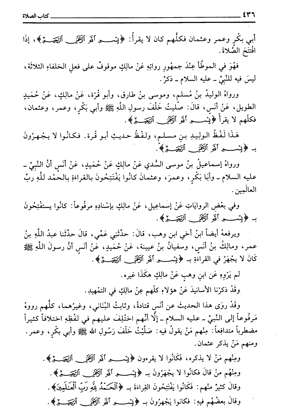 وَرَوَاهُ الْوَلِيدُ بْنُ مُسْلِمٍ وَمُوسَى بْنُ طَارِقٍ وَأَبُو قُرَّةَ عَنْ مَالِكٍ عَنْ حُمَيْدٍ الطَّوِيلِ عَنْ أَنَسٍ قَالَ صَلَّيْتُ خَلْفَ رَسُولِ اللَّهِ صَلَّى اللَّهُ عَلَيْهِ وَسَلَّمَ وَأَبِي بَكْرٍ وَعُمَرَ وَعُثْمَانَ فَكُلُّهُمْ لَا يَقْرَأُ (بِسْمِ اللَّهِ الرَّحْمَنِ الرَّحِيمِ)