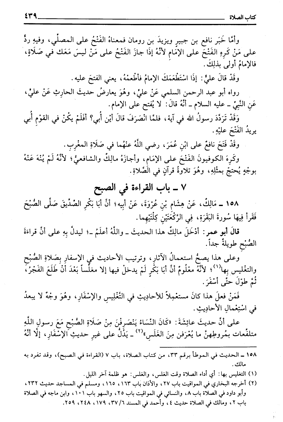 158 - مَالِكٌ عَنْ هِشَامِ بْنِ عُرْوَةَ عَنْ أَبِيهِ أَنَّ أَبَا بَكْرٍ الصِّدِّيقَ صَلَّى الصُّبْحَ فَقَرَأَ فِيهَا سُورَةَ الْبَقَرَةِ فِي الرَّكْعَتَيْنِ كِلْتَيْهِمَا