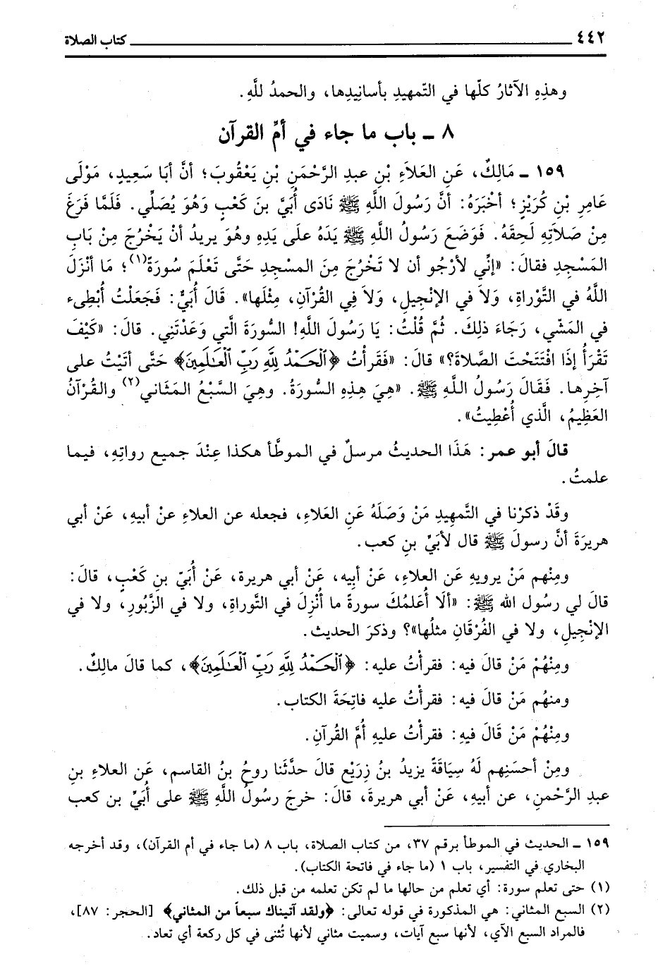 159 - مَالِكٌ عَنِ الْعَلَاءِ بْنِ عَبْدِ الرَّحْمَنِ بْنِ يَعْقُوبَ أَنَّ أَبَا سَعِيدٍ مَوْلَى عَامِرِ بْنِ كُرَيْزٍ أَخْبَرَهُ أَنَّ رَسُولَ اللَّهِ صَلَّى اللَّهُ عَلَيْهِ وَسَلَّمَ نَادَى أُبَيَّ بْنَ كَعْبٍ وَهُوَ يُصَلِّي فَلَمَّا فَرَغَ مِنْ صَلَاتِهِ لِحِقَهُ فَوَضَعَ رَسُولُ اللَّهِ صَلَّى اللَّهُ عَلَيْهِ وَسَلَّمَ يَدَهُ عَلَى يَدِهِ وَهُوَ يُرِيدُ أَنْ يَخْرُجَ مِنْ بَابِ الْمَسْجِدِ فَقَالَ ((إِنِّي لَأَرْجُوَ أَنْ لَا تَخْرُجَ مِنَ الْمَسْجِدِ حَتَّى تَعْلَمَ سُورَةً (1) مَا أَنْزَلَ اللَّهُ فِي التَّوْرَاةِ وَلَا فِي الْإِنْجِيلِ وَلَا فِي الْقُرْآنِ مِثْلَهَا)) قَالَ أُبَيُّ فَجَعَلَتْ أُبْطِئُ فِي الْمَشْيِ رَجَاءَ ذَلِكَ ثُمَّ قَلْتُ يَا رَسُولَ اللَّهِ! السُّورَةَ الَّتِي وَعَدْتَنِي قَالَ ((كَيْفَ تَقْرَأُ إِذَا افْتَتَحْتَ الصَّلَاةَ)) قَالَ ((فَقَرَأْتُ (الْحَمْدُ لِلَّهِ رَبِّ الْعَالَمِينَ) حَتَّى أَتَيْتُ عَلَى آخِرِهَا فَقَالَ رَسُولُ اللَّهِ صَلَّى اللَّهُ عَلَيْهِ وَسَلَّمَ ((هِيَ هَذِهِ السُّورَةُ وَهِيَ السَّبْعُ الْمَثَانِي (2) وَالْقُرْآنُ الْعَظِيمُ الَّذِي أُعْطِيتُ))