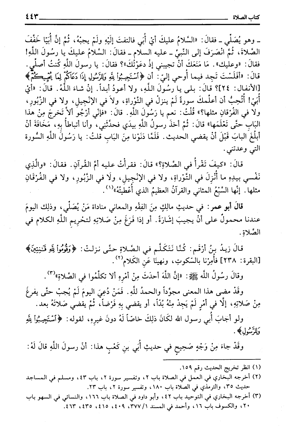 - وَهُوَ يُصَلِّي - فَقَالَ ((السَّلَامُ عَلَيْكَ أَيْ أُبَيُّ فَالْتَفَتَ إِلَيْهِ وَلَمْ يُجِبْهُ ثُمَّ إِنَّ أُبَيًّا خَفَّفَ الصَّلَاةَ ثُمَّ انْصَرَفَ إِلَى النَّبِيِّ - عَلَيْهِ السَّلَامُ - فَقَالَ السَّلَامُ عَلَيْكَ يَا رَسُولَ اللَّهِ! فَقَالَ ((وَعَلَيْكَ)) مَا مَنَعَكَ أَنْ تُجِيبَنِي إِذْ دَعَوْتُكَ)) فَقَالَ يَا رَسُولَ اللَّهِ كُنْتُ أُصَلِّي قَالَ ((أَفَلَسْتَ تَجِدُ فِيمَا أَوْحِيَ إِلَيَّ أَنِ (اسْتَجِيبُوا لِلَّهِ وَلِلرَّسُولِ إِذَا دَعَاكُمْ لِمَا يُحْيِيكُمْ) الْأَنْفَالِ 24 قَالَ بَلَى يَا رَسُولَ اللَّهِ وَلَا أَعُودُ أَبَدًا إِنْ شَاءَ اللَّهُ قَالَ ((أَيْ أُبَيُّ! أَتُحِبُّ أَنْ أُعَلِّمَكَ سُورَةً لَمْ يَنْزِلْ فِي التَّوْرَاةِ وَلَا فِي الْإِنْجِيلِ وَلَا فِي الزَّبُورِ وَلَا فِي الْفُرْقَانِ مِثْلُهَا)) قُلْتُ نَعَمْ يَا رَسُولَ اللَّهِ قَالَ ((فَإِنِّي أَرْجُو أَلَّا تَخْرُجَ مِنْ هَذَا الْبَابِ حَتَّى تَعْلَمَهَا)) قَالَ ثم أخذ رسول الله بِيَدِي فَحَدَّثَنِي وَأَنَا أَتَبَاطَأُ بِهِ مَخَافَةَ أَنْ أَبْلُغَ الْبَابَ قَبْلَ أَنْ يَقْضِيَ الْحَدِيثَ فَلَمَّا دَنَوْنَا مِنَ الْبَابِ قُلْتُ يَا رَسُولَ اللَّهِ السُّورَةَ الَّتِي وَعَدْتَنِي