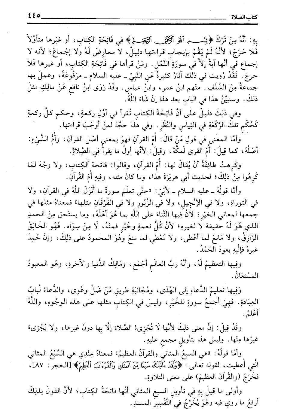 بِهِ إِنَّهُ مَنْ تَرَكَ (بِسْمِ اللَّهِ الرَّحْمَنِ الرَّحِيمِ) فِي فَاتِحَةِ الْكِتَابِ أَوْ غَيْرِهَا مُتَأَوِّلًا فَلَا حَرَجَ لِأَنَّهُ لَمْ يَقُمْ بِإِيجَابِ قِرَاءَتِهَا دَلِيلٌ لَا مُعَارِضَ لَهُ وَلَا إِجْمَاعَ لِأَنَّهُ لَا إِجْمَاعَ فِي أَنَّهَا آيَةٌ إِلَّا فِي سُورَةِ النَّمْلِ وَمَنْ قَرَأَهَا فِي فَاتِحَةِ الْكِتَابِ أَوْ غَيْرِهَا فَلَا حَرَجَ فَقَدْ رُوِيَتْ فِي ذَلِكَ آثَارٌ كَثِيرَةٌ عَنِ النَّبِيِّ - عَلَيْهِ السَّلَامُ - مَرْفُوعَةٌ وَعَمِلَ بِهَا جَمَاعَةٌ مِنَ السَّلَفِ مِنْهُمْ بن عمر وبن عباس وقد روى بن نَافِعٍ عَنْ مَالِكٍ مِثْلَ ذَلِكَ وَسَنُبَيِّنُ هَذَا فِي الْبَابِ بَعْدَ هَذَا إِنْ شَاءَ اللَّهُ