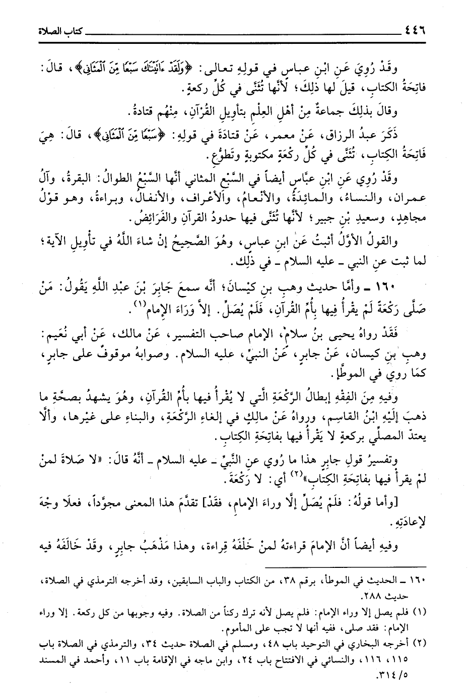 160 - وَأَمَّا حَدِيثُ وَهْبِ بْنِ كَيْسَانَ أَنَّهُ سَمِعَ جَابِرَ بْنَ عَبْدِ اللَّهِ يَقُولُ مَنْ صَلَّى رَكْعَةً لَمْ يَقْرَأْ فِيهَا بِأُمِّ الْقُرْآنِ فَلَمْ يُصَلِّ إِلَّا وَرَاءَ الْإِمَامِ