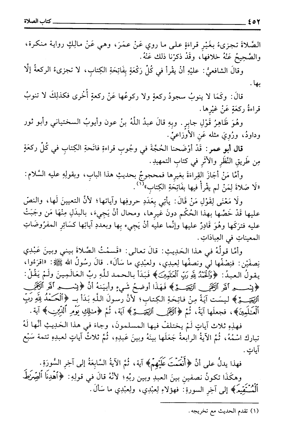 قَالَ أَبُو عُمَرَ قَدْ أَوْضَحْنَا الْحُجَّةَ فِي وُجُوبِ قِرَاءَةِ فَاتِحَةِ الْكِتَابِ فِي كُلِّ رَكْعَةٍ مِنْ طَرِيقِ النَّظَرِ وَالْأَثَرِ فِي كِتَابِ التَّمْهِيدِ