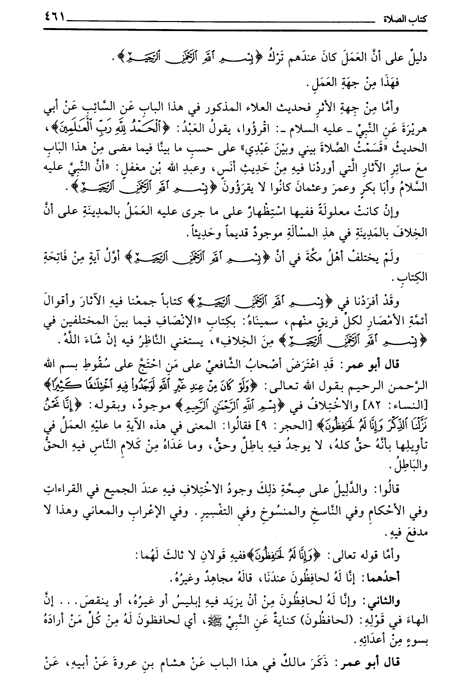 قَالَ أَبُو عُمَرَ قَدِ اعْتَرَضَ أَصْحَابُ الشَّافِعِيِّ عَلَى مَنِ احْتَجَّ عَلَى سُقُوطِ بِسْمِ اللَّهِ الرَّحْمَنِ الرَّحِيمِ بِقَوْلِ اللَّهِ تَعَالَى (وَلَوْ كَانَ مِنْ عِنْدِ غَيْرِ اللَّهِ لَوَجَدُوا فِيهِ اخْتِلَافًا كَثِيرًا) النِّسَاءِ 82 وَالِاخْتِلَافُ فِي (بِسْمِ اللَّهِ الرَّحْمَنِ الرَّحِيمِ) مَوْجُودٌ وَبِقَوْلِهِ (إِنَّا نَحْنُ نَزَّلْنَا الذِّكْرَ وَإِنَّا لَهُ لَحَافِظُونَ) الْحِجْرِ 9 فَقَالُوا الْمَعْنَى فِي هَذِهِ الْآيَةِ مَا عَلَيْهِ الْعَمَلُ فِي تَأْوِيلِهَا بِأَنَّهُ حَقُّ كُلُّهُ لَا يُوجَدُ فِيهِ بَاطِلٌ وَحَقٌّ وَمَا عَدَاهُ مِنْ كَلَامِ النَّاسِ فِيهِ الْحَقُّ وَالْبَاطِلُ