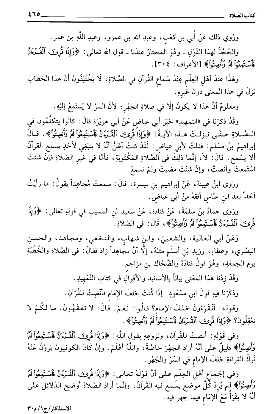 وَفِي إِجْمَاعِ أَهْلِ الْعِلْمِ عَلَى أَنَّ قَوْلَهُ تَعَالَى (وَإِذَا قُرِئَ الْقُرْآنُ فَاسْتَمِعُوا لَهُ وَأَنْصِتُوا) لَمْ يُرِدْ كُلَّ مَوْضِعٍ يُسْمَعُ فِيهِ الْقُرْآنُ وَإِنَّمَا أَرَادَ الصَّلَاةَ أَوْضَحُ الدَّلَائِلِ عَلَى أَنَّهُ لَا يَقْرَأُ مَعَ الْإِمَامِ فِيمَا جَهَرَ فِيهِ