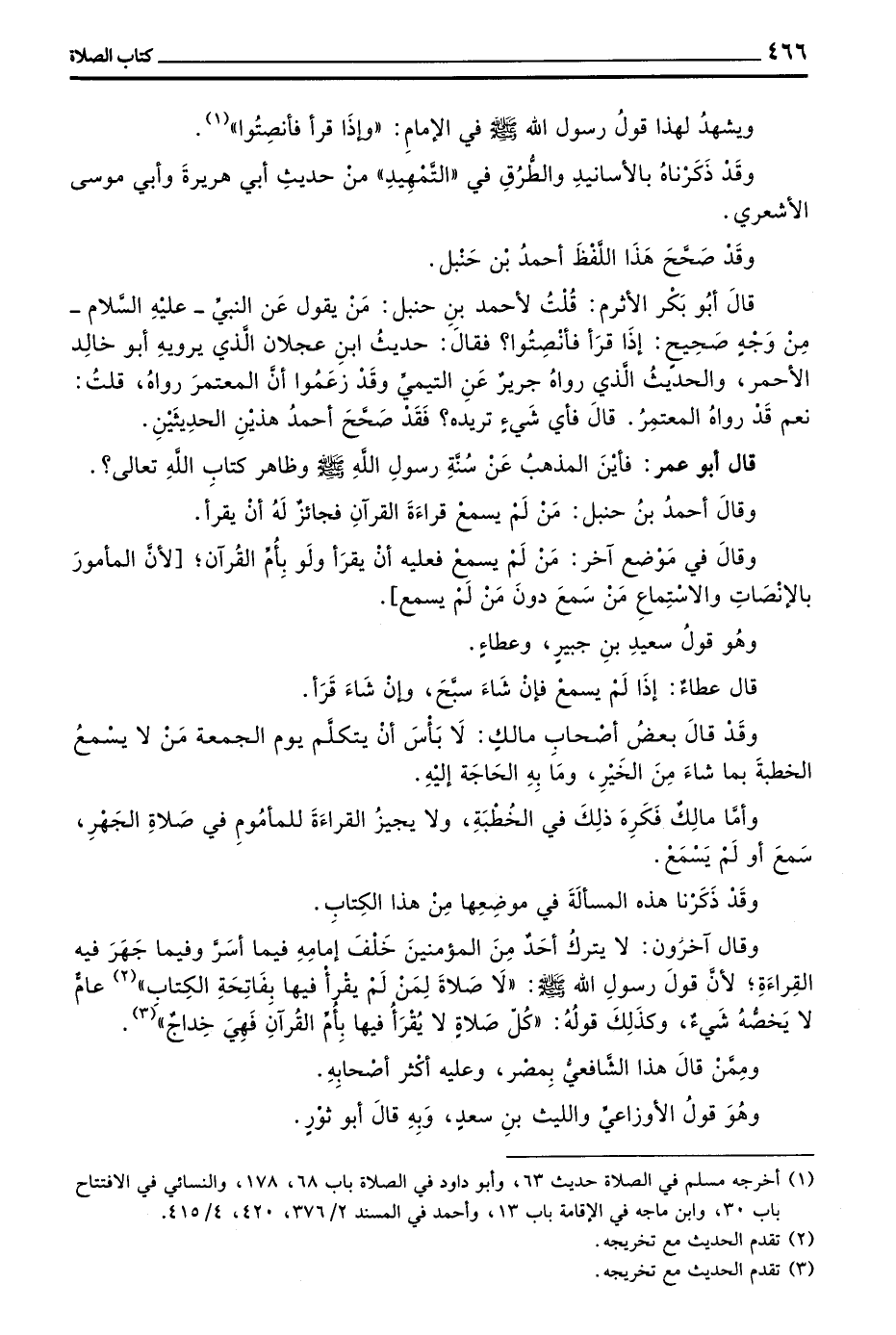 وَقَالَ آخَرُونَ لَا يَتْرُكُ أَحَدٌ مِنَ الْمُؤْمِنِينَ خَلْفَ إِمَامِهِ فِيمَا أَسَرَّ وَفِيمَا جَهَرَ فِيهِ الْقِرَاءَةَ لِأَنَّ قَوْلَ رَسُولِ اللَّهِ صَلَّى اللَّهُ عَلَيْهِ وَسَلَّمَ ((لَا صَلَاةَ لِمَنْ لَمْ يَقْرَأْ فِيهَا بِفَاتِحَةِ الْكِتَابِ)) عَامُّ لَا يَخُصُّهُ شَيْءٌ وَكَذَلِكَ قَوْلُهُ ((كُلُّ صَلَاةٍ لَا يُقْرَأُ فِيهَا بِأُمِّ الْقُرْآنِ فَهِيَ خِدَاجٌ))