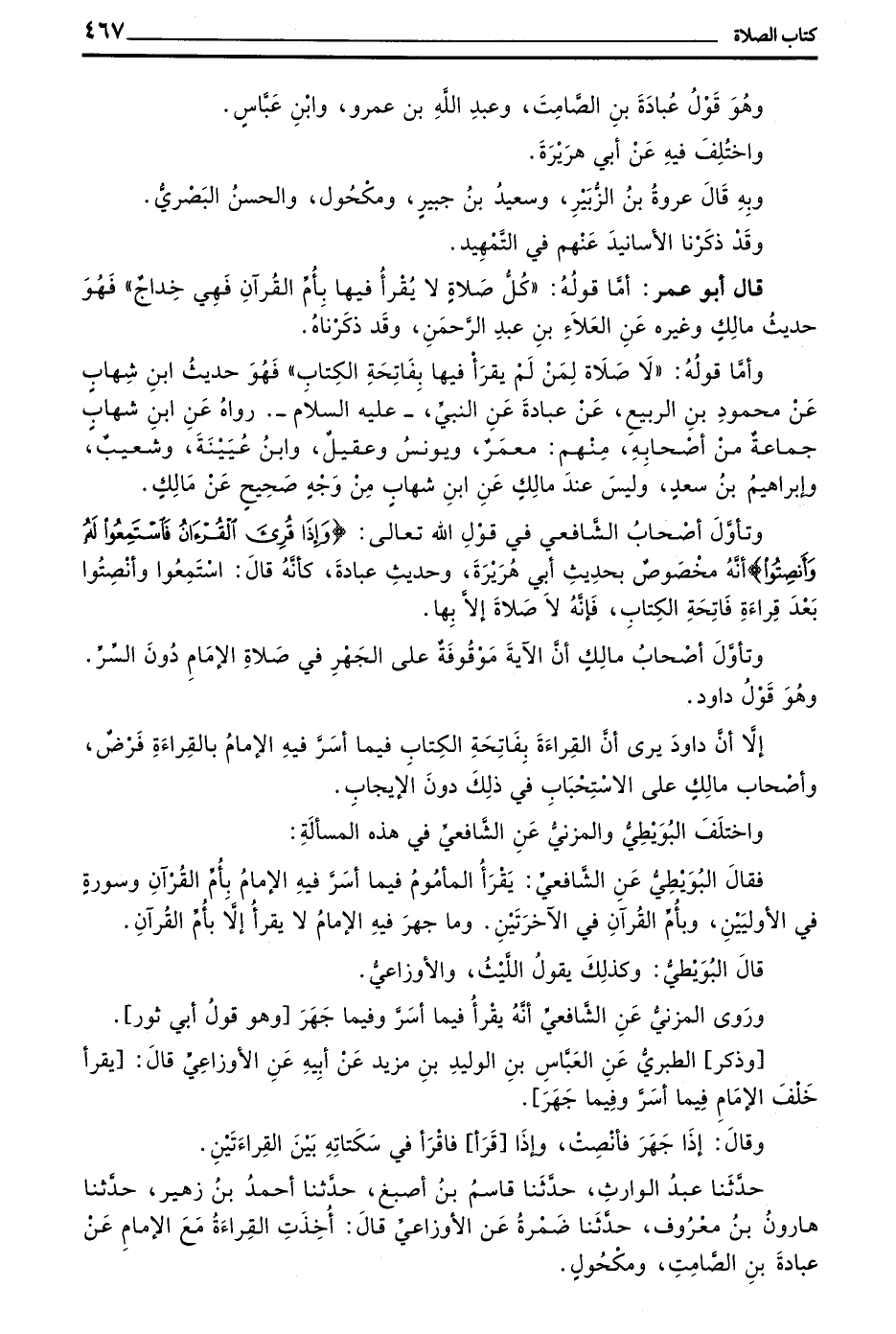 وَأَمَّا قَوْلُهُ ((لَا صَلَاةَ لِمَنْ لَمْ يَقْرَأْ فِيهَا بفاتحة الكتاب)) فهو حديث بن شِهَابٍ عَنْ مَحْمُودِ بْنِ الرَّبِيعِ عَنْ عُبَادَةَ عن النبي - عليه السلام - رواه عن بن شِهَابٍ جَمَاعَةٌ مِنْ أَصْحَابِهِ مِنْهُمْ مَعْمَرٌ وَيُونُسُ وعقيل وبن عُيَيْنَةَ وَشُعَيْبٌ وَإِبْرَاهِيمُ بْنُ سَعْدٍ وَلَيْسَ عِنْدَ مالك عن بن شِهَابٍ مِنْ وَجْهٍ صَحِيحٍ عَنْ مَالِكٍ