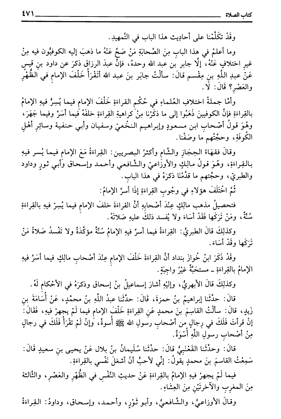 قَالَ حَدَّثَنَا إِبْرَاهِيمُ بْنُ حَمْزَةَ قَالَ حَدَّثَنَا عَبْدُ اللَّهِ بْنُ مُحَمَّدٍ عَنْ أُسَامَةَ بْنِ زَيْدٍ قَالَ سَأَلْتُ الْقَاسِمَ بْنَ مُحَمَّدٍ عَنِ الْقِرَاءَةِ خَلْفَ الْإِمَامِ فِيمَا لَمْ يَجْهَرْ فِيهِ فَقَالَ إِنْ قَرَأْتَ فَلَكَ فِي رِجَالٍ مِنْ أَصْحَابِ رَسُولِ اللَّهِ صَلَّى اللَّهُ عَلَيْهِ وَسَلَّمَ أُسْوَةٌ وَإِنْ لَمْ تَقْرَأْ فَلَكَ فِي رِجَالٍ مِنْ أصحاب رسول الله أُسْوَةٌ
