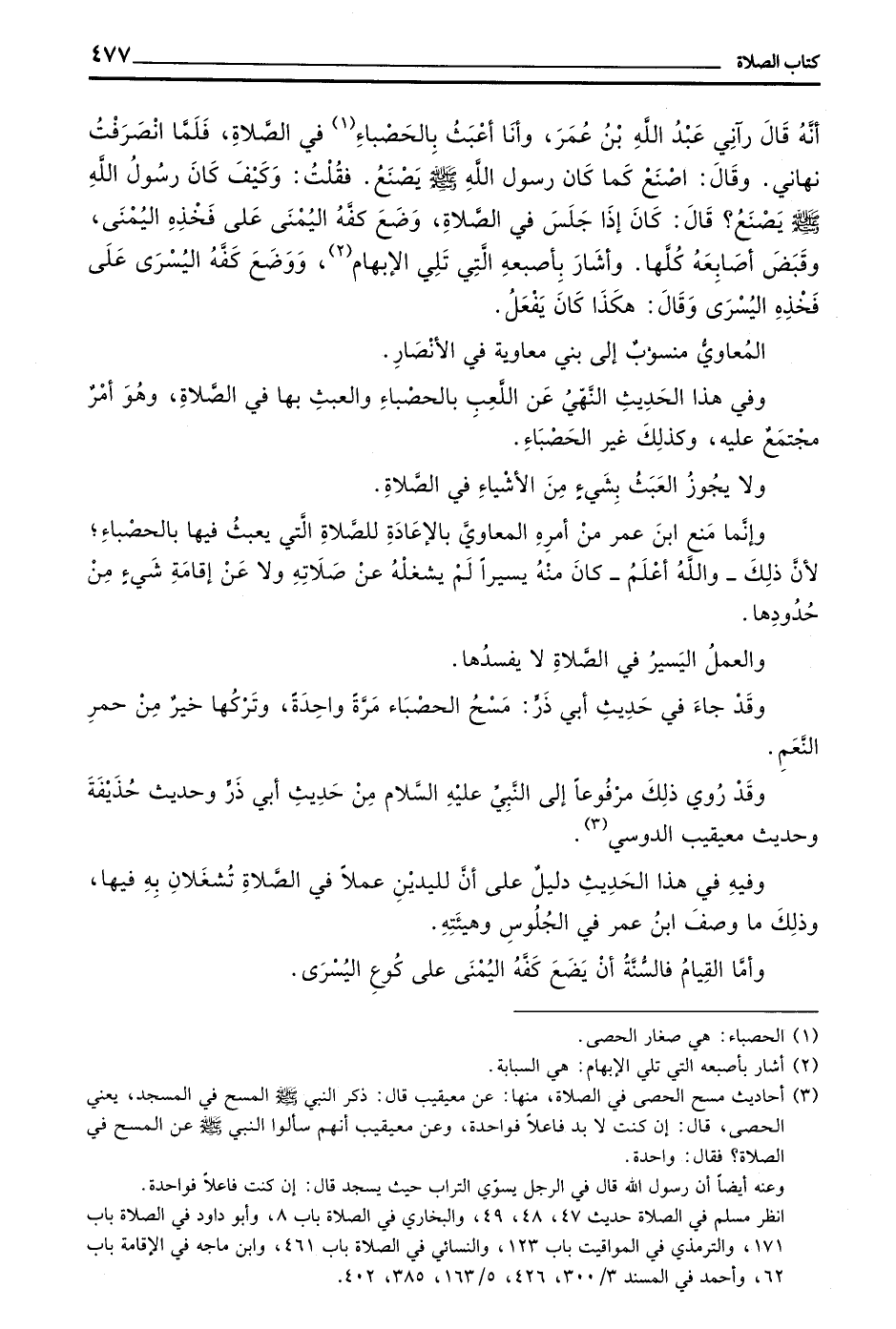 وإنما منع بن عُمَرَ مِنْ أَمْرِهِ الْمُعَاوِيَّ بِالْإِعَادَةِ لِلصَّلَاةِ الَّتِي يَعْبَثُ فِيهَا بِالْحَصْبَاءِ لِأَنَّ ذَلِكَ - وَاللَّهُ أَعْلَمُ - كَانَ مِنْهُ يَسِيرًا لَمْ يَشْغَلْهُ عَنْ صَلَاتِهِ وَلَا عَنْ إِقَامَةِ شَيْءٍ مِنْ حُدُودِهَا
