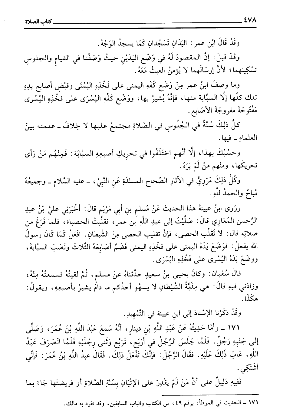 وَمَا وَصَفَ بن عُمَرَ مِنْ وَضْعِ كَفِّهِ الْيُمْنَى عَلَى فَخْذِهِ الْيُمْنَى وَقَبْضِ أَصَابِعِ يَدِهِ تِلْكَ كُلِّهَا إِلَّا السَّبَّابَةَ مِنْهَا فَإِنَّهُ يُشِيرُ بِهَا وَوَضْعِ كَفِّهِ الْيُسْرَى عَلَى فَخْذِهِ الْيُسْرَى مَفْتُوحَةً مَفْرُوجَةَ الْأَصَابِعِ كُلُّ ذَلِكَ سُنَّةٌ فِي الْجُلُوسِ فِي الصَّلَاةِ مُجْتَمَعٌ عَلَيْهَا لَا خِلَافَ - عَلِمْتُهُ بَيْنَ الْعُلَمَاءِ - فِيهَا
