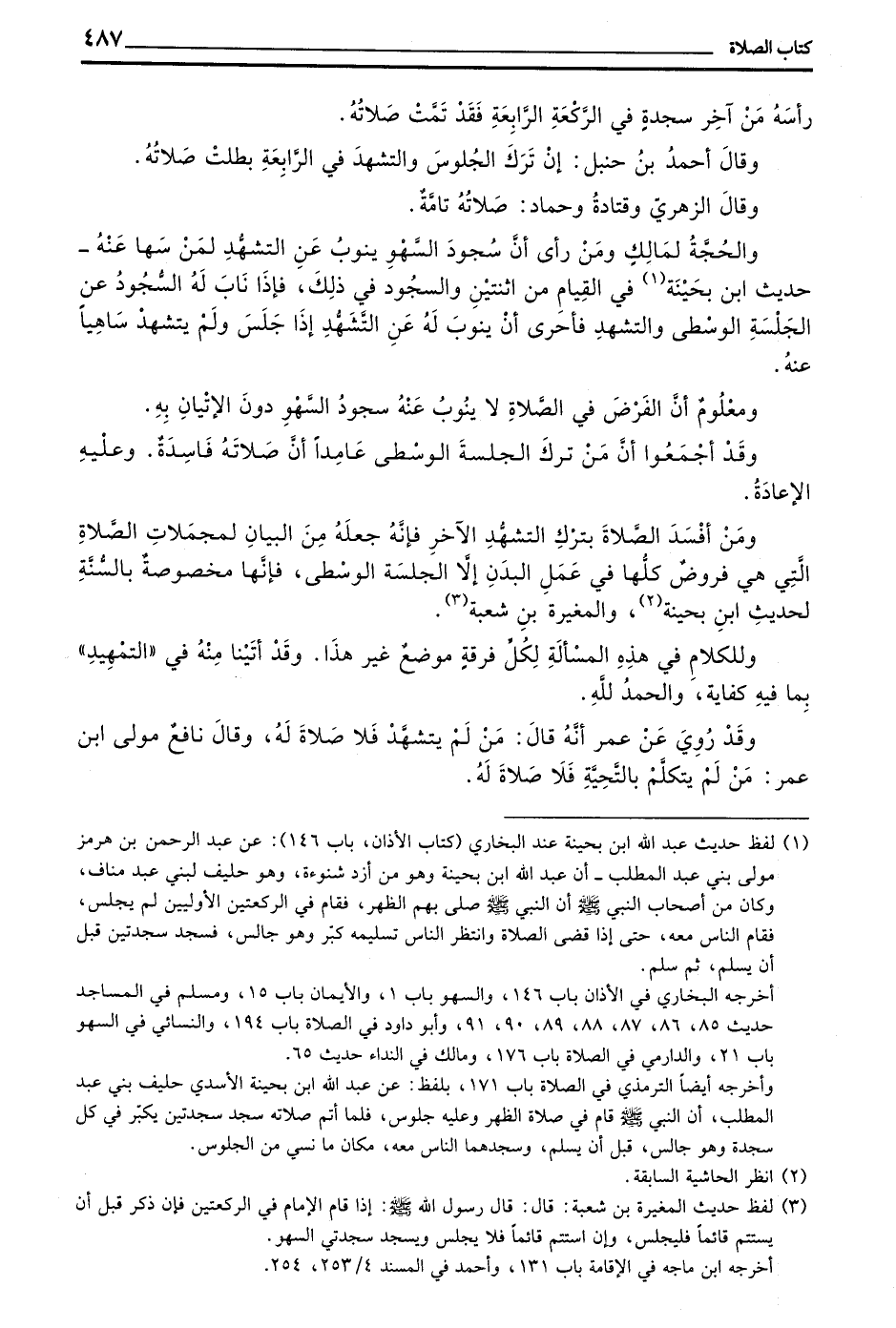 وَقَالَ أَحْمَدُ بْنُ حَنْبَلٍ إِنْ تَرَكَ الْجُلُوسَ وَالتَّشَهُّدَ فِي الرَّابِعَةِ بَطَلَتْ صَلَاتُهُ