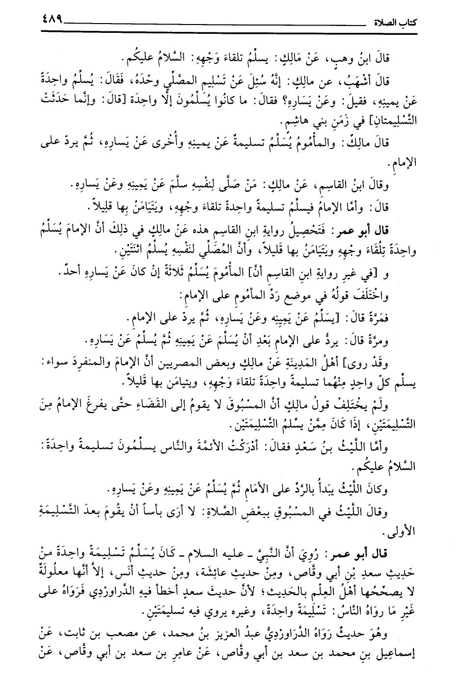 وَأَمَّا اللَّيْثُ بْنُ سَعْدٍ فَقَالَ أَدْرَكْتُ الْأَئِمَّةَ وَالنَّاسُ يُسَلِّمُونَ تَسْلِيمَةً وَاحِدَةً السَّلَامُ عَلَيْكُمْ