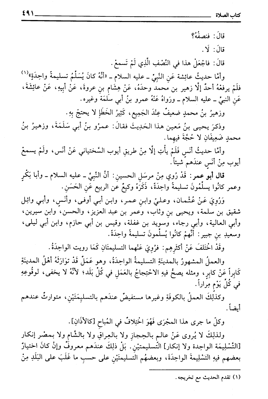 وَأَمَّا حَدِيثُ عَائِشَةَ عَنِ النَّبِيِّ - عَلَيْهِ السَّلَامُ - ((أَنَّهُ كَانَ يُسَلِّمُ تَسْلِيمَةً وَاحِدَةً)) فَلَمْ يَرْفَعْهُ أَحَدٌ إِلَّا زُهَيْرُ بْنُ مُحَمَّدٍ وَحْدَهُ عَنْ هِشَامِ بْنِ عُرْوَةَ عَنْ أَبِيهِ عَنْ عَائِشَةَ عَنِ النَّبِيِّ - عَلَيْهِ السَّلَامُ - وَرَوَاهُ عَنْهُ عَمْرُو بْنُ أَبِي سَلَمَةَ وَغَيْرُهُ