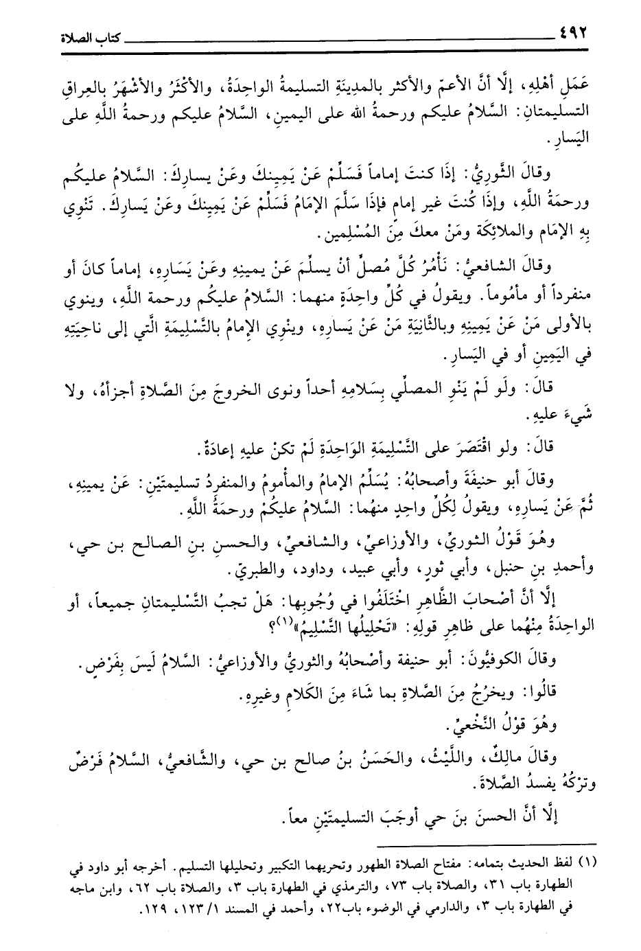 عَمَلِ أَهْلِهِ إِلَّا أَنَّ الْأَعَمَّ وَالْأَكْثَرَ بِالْمَدِينَةِ التَّسْلِيمَةُ الْوَاحِدَةُ وَالْأَكْثَرُ وَالْأَشْهَرُ بِالْعِرَاقِ التَّسْلِيمَتَانِ السَّلَامُ عَلَيْكُمْ وَرَحْمَةُ اللَّهِ عَلَى الْيَمِينِ السَّلَامُ عَلَيْكُمْ وَرَحْمَةُ اللَّهِ عَلَى الْيَسَارِ