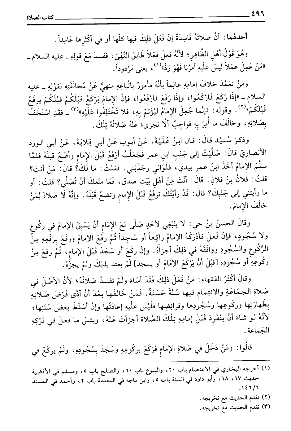 وَقَالَ أَكْثَرُ الْفُقَهَاءِ مَنْ فَعَلَ ذَلِكَ فَقَدْ أَسَاءَ وَلَمْ تَفْسَدْ صَلَاتُهُ لِأَنَّ الْأَصْلَ فِي صَلَاةِ الْجَمَاعَةِ وَالِائْتِمَامِ فِيهَا سُنَّةٌ حَسَنَةٌ فَمَنْ خَالَفَهَا بَعْدَ أَنْ أَدَّى فَرْضَ صَلَاتِهِ بِطَهَارَتِهَا وَرُكُوعِهَا وَسُجُودِهَا وَفَرَائِضِهَا فَلَيْسَ عَلَيْهِ إِعَادَتُهَا وَإِنْ أَسْقَطَ بَعْضَ سُنَنِهَا لِأَنَّهُ لَوْ شَاءَ أَنْ يَنْفَرِدَ قَبْلَ إِمَامِهِ تِلْكَ الصَّلَاةَ أَجْزَأَتْ عَنْهُ وَبِئْسَ مَا فَعَلَ فِي تَرْكِهِ الْجَمَاعَةَ