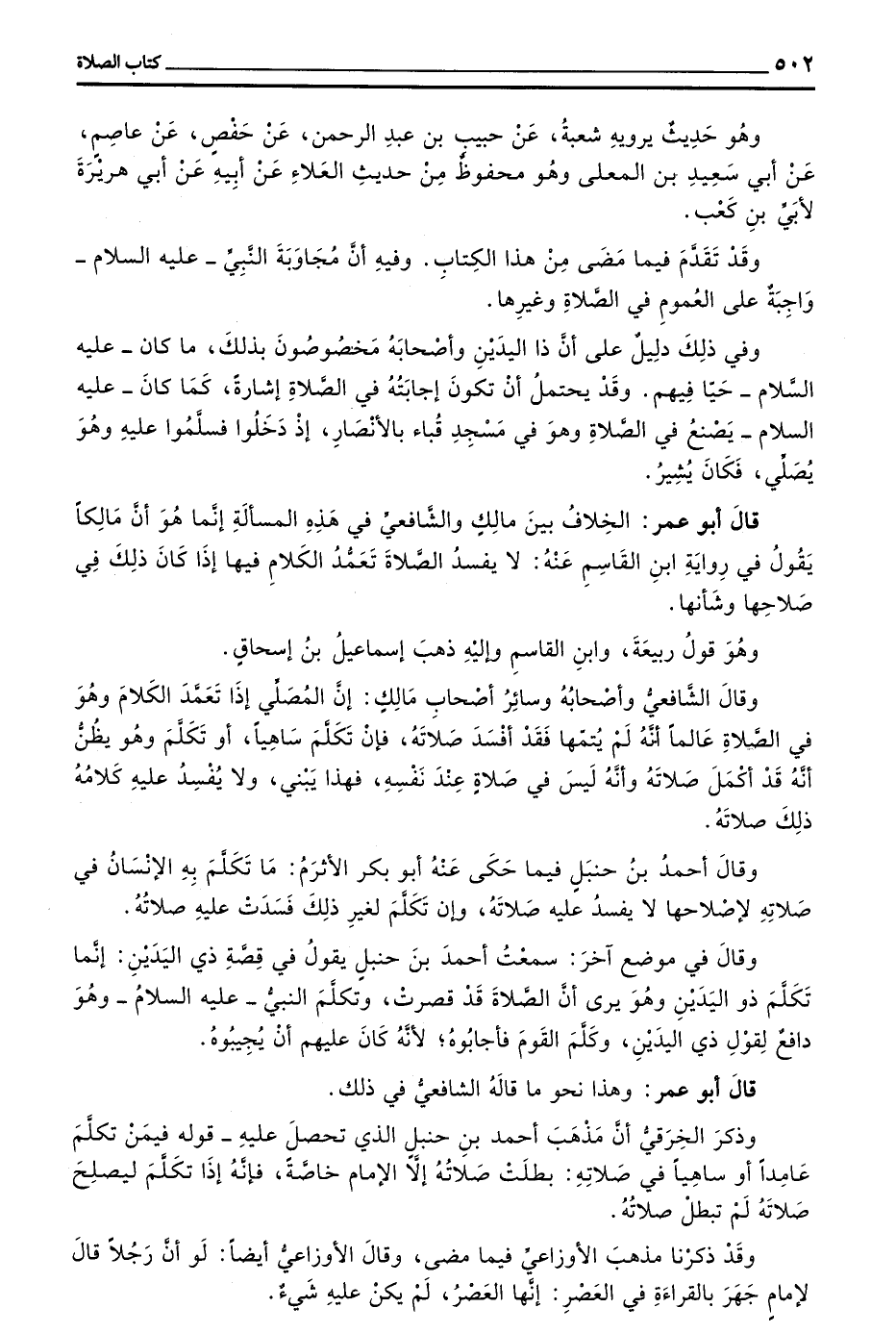 وَقَالَ فِي مَوْضِعٍ آخَرَ سَمِعْتُ أَحْمَدَ بْنَ حَنْبَلٍ يَقُولُ فِي قِصَّةِ ذِي الْيَدَيْنِ إِنَّمَا تَكَلَّمَ ذُو الْيَدَيْنِ وَهُوَ يَرَى أَنَّ الصَّلَاةَ قَدْ قَصُرَتْ وَتَكَلَّمَ النَّبِيُّ - عَلَيْهِ السَّلَامُ - وَهُوَ دَافِعٌ لِقَوْلِ ذِي الْيَدَيْنِ وَكَلَّمَ الْقَوْمَ فَأَجَابُوهُ لِأَنَّهُ كَانَ عَلَيْهِمْ أَنْ يجيبوه