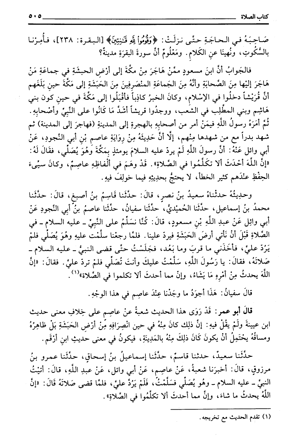 وَحَدِيثُهُ حَدَّثَنَاهُ سَعِيدُ بْنُ نَصْرٍ قَالَ حَدَّثَنَا قَاسِمُ بْنُ أَصْبَغَ قَالَ حَدَّثَنَا مُحَمَّدُ بْنُ إِسْمَاعِيلَ حَدَّثَنَا الْحُمَيْدِيُّ حَدَّثَنَا سُفْيَانُ حَدَّثَنَا عَاصِمُ بْنُ أَبِي النُّجُودِ عَنْ أَبِي وَائِلٍ عَنْ عَبْدِ اللَّهِ بْنِ مَسْعُودٍ قَالَ كُنَّا نُسَلِّمُ عَلَى النَّبِيِّ - عَلَيْهِ السَّلَامُ - فِي الصَّلَاةِ قَبْلَ أَنْ نَأْتِيَ أَرْضَ الْحَبَشَةِ فَيَرُدُّ عَلَيْنَا فَلَمَّا رَجَعْنَا سَلَّمْتُ عَلَيْهِ وَهُوَ يُصَلِّي فَلَمْ يَرُدَّ عَلِيَّ فَأَخَذَنِي مَا قَرُبَ وَمَا بَعُدَ فَجَلَسْتُ حَتَّى قَضَى النَّبِيُّ - عَلَيْهِ السَّلَامُ - صَلَاتَهُ فَقَالَ يَا رَسُولَ اللَّهِ سَلَّمْتُ عَلَيْكَ وَأَنْتَ تُصَلِّي فَلَمْ تَرُدَّ عَلِيَّ فَقَالَ ((إِنَّ اللَّهَ يُحْدِثُ مِنْ أَمْرِهِ مَا يَشَاءُ وَإِنَّ مِمَّا أَحْدَثَ أَلَّا تَكَلَّمُوا فِي الصَّلَاةِ))
