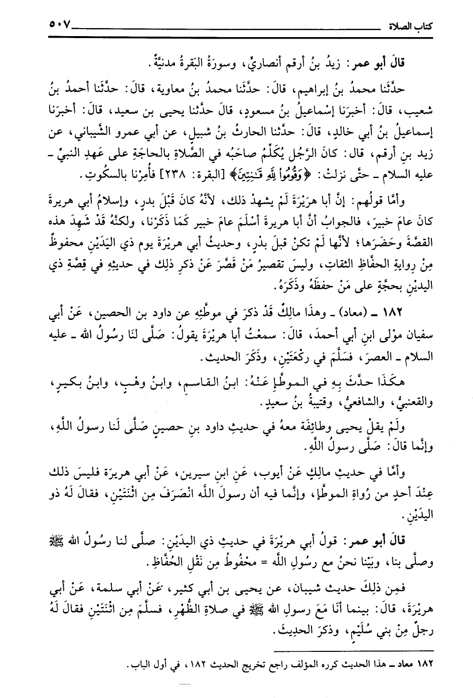 182 - (مُعَادٌ) - وَهَذَا مَالِكٌ قَدْ ذَكَرَ فِي مُوَطَّئِهِ عَنْ دَاوُدَ بْنِ الْحُصَيْنِ عَنْ أَبِي سُفْيَانَ مولى بن أَبِي أَحْمَدَ قَالَ سَمِعْتُ أَبَا هُرَيْرَةَ يَقُولُ صَلَّى لَنَا رَسُولُ اللَّهِ - عَلَيْهِ السَّلَامُ - الْعَصْرَ فَسَلَّمَ فِي رَكْعَتَيْنِ وَذَكَرَ الْحَدِيثَ