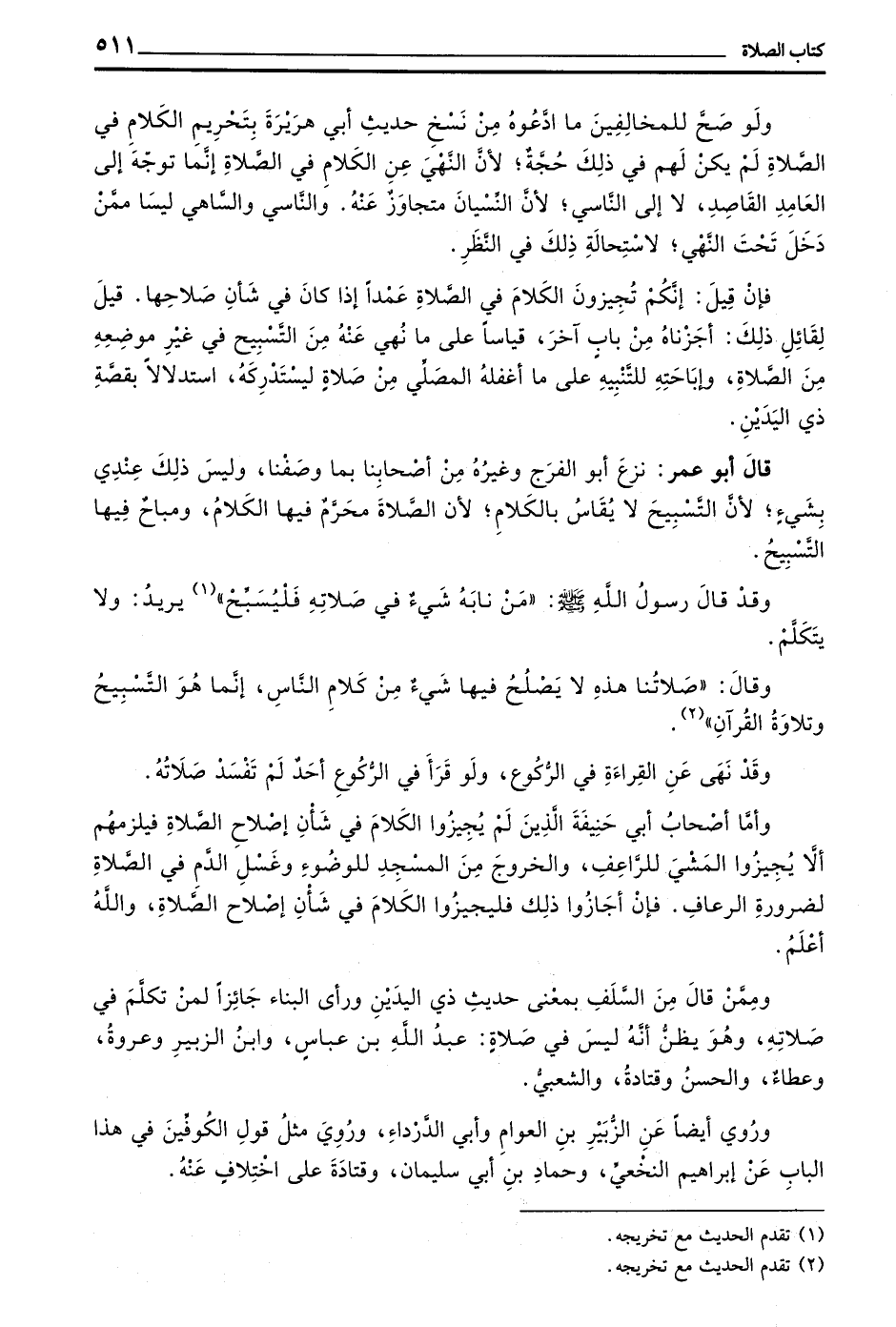 وَلَوْ صَحَّ لِلْمُخَالِفِينَ مَا ادَّعَوْهُ مِنْ نَسْخِ حَدِيثِ أَبِي هُرَيْرَةَ بِتَحْرِيمِ الْكَلَامِ فِي الصَّلَاةِ لَمْ يَكُنْ لَهُمْ فِي ذَلِكَ حُجَّةٌ لِأَنَّ النَّهْيَ عَنِ الْكَلَامِ فِي الصَّلَاةِ إِنَّمَا تَوَجَّهَ إِلَى الْعَامِدِ الْقَاصِدِ لَا إِلَى النَّاسِي لِأَنَّ النِّسْيَانَ مُتَجَاوَزٌ عَنْهُ وَالنَّاسِي وَالسَّاهِي لَيْسَا مِمَّنْ دَخَلَ تَحْتَ النَّهْيِ لِاسْتِحَالَةِ ذَلِكَ فِي النَّظَرِ