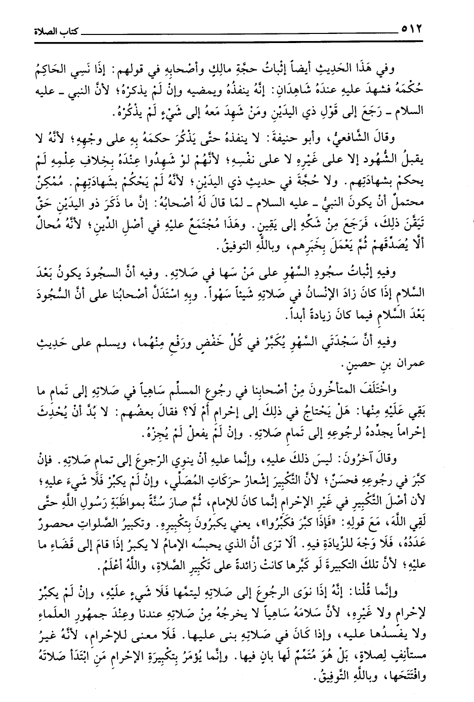 وَاخْتَلَفَ الْمُتَأَخِّرُونَ مِنْ أَصْحَابِنَا فِي رُجُوعِ الْمُسْلِمِ سَاهِيًا فِي صَلَاتِهِ إِلَى تَمَامِ مَا بَقِيَ عَلَيْهِ مِنْهَا هَلْ يَحْتَاجُ فِي ذَلِكَ إِلَى إِحْرَامٍ أَمْ لَا فَقَالَ بَعْضُهُمْ لَا بُدَّ أَنْ يُحْدِثَ إِحْرَامًا يُجَدِّدُهُ لِرُجُوعِهِ إِلَى تَمَامِ صَلَاتِهِ وَإِنْ لَمْ يَفْعَلْ لَمْ يُجْزِهِ