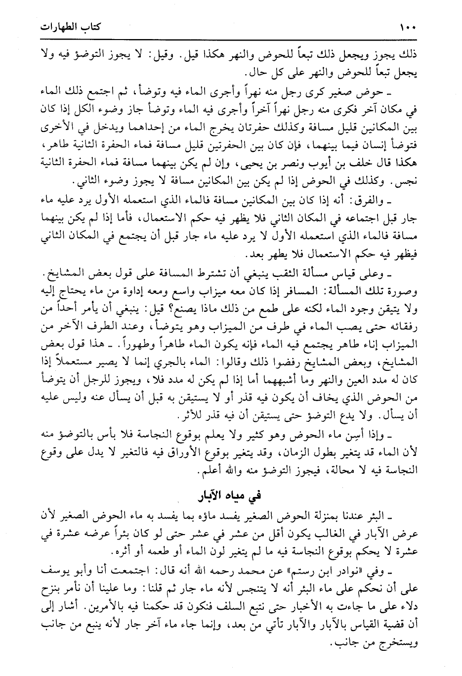 حوض صغير كرى رجل منه نهراً وأجرى الماء فيه وتوضأ، ثم اجتمع ذلك الماء في مكان آخر فكرى منه رجل نهراً آخراً وأجرى فيه الماء وتوضأ جاز وضوء الكل إذا كان بين المكانين قليل مسافة وكذلك حفرتان يخرج الماء من إحداهما ويدخل في الأخرى فتوضأ إنسان فيما بينهما، فإن كان بين الحفرتين قليل مسافة فماء الحفرة الثانية طاهر، هكذا قال خلف بن أيوب ونصر بن يحيى، وإن لم يكن بينهما مسافة فماء الحفرة الثانية نجس. وكذلك في الحوض إذا لم يكن بين المكانين مسافة لا يجوز وضوء الثاني.