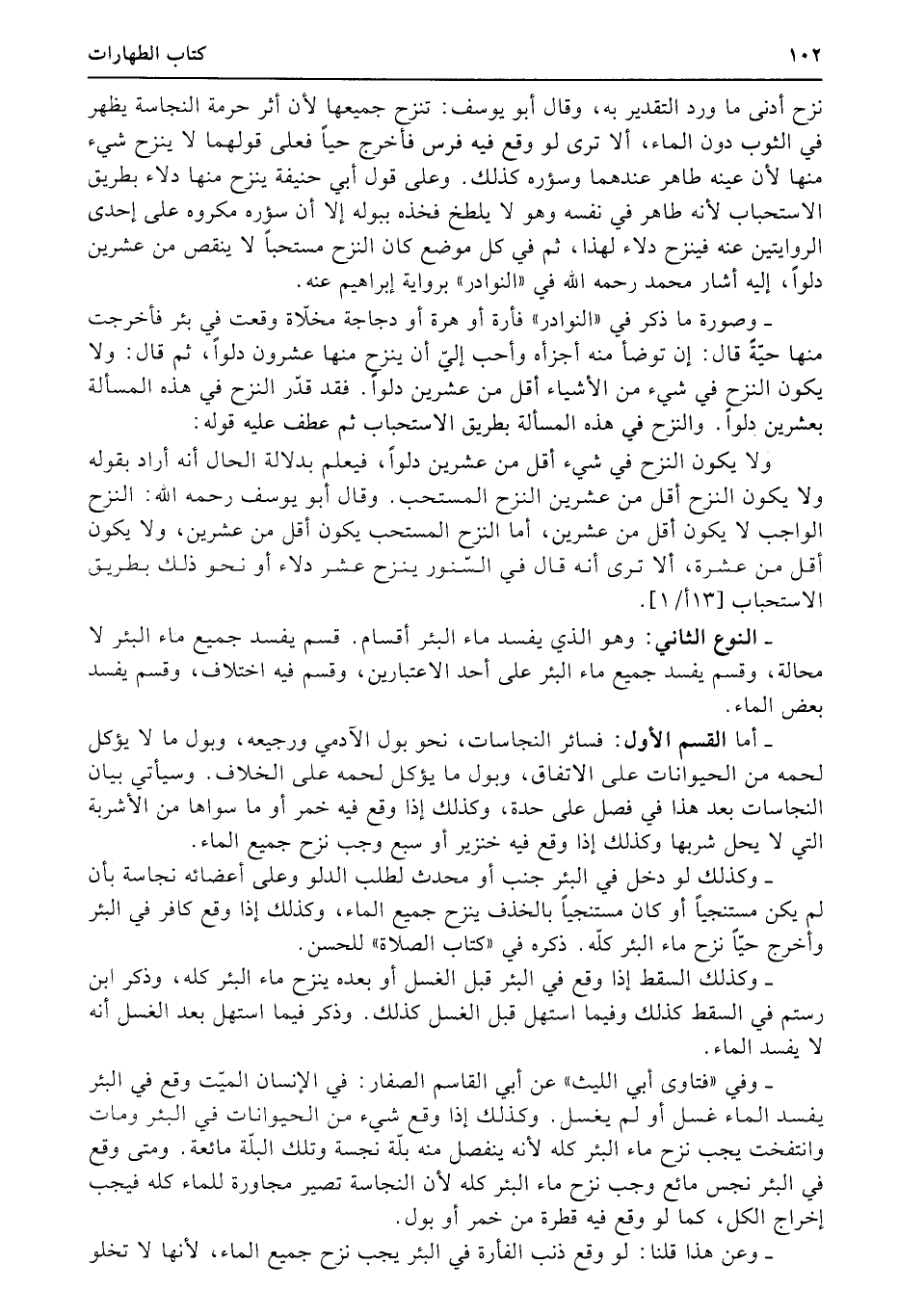 أما القسم الأول: فسائر النجاسات، نحو بول الآدمي ورجيعه، وبول ما لا يؤكل لحمه من الحيوانات على الاتفاق، وبول ما يؤكل لحمه على الخلاف. وسيأتي بيان النجاسات بعد هذا في فصل على حدة، وكذلك إذا وقع فيه خمر أو ما سواها من الأشربة التي لا يحل شربها وكذلك إذا وقع فيه خنزير أو سبع وجب نزح جميع الماء.