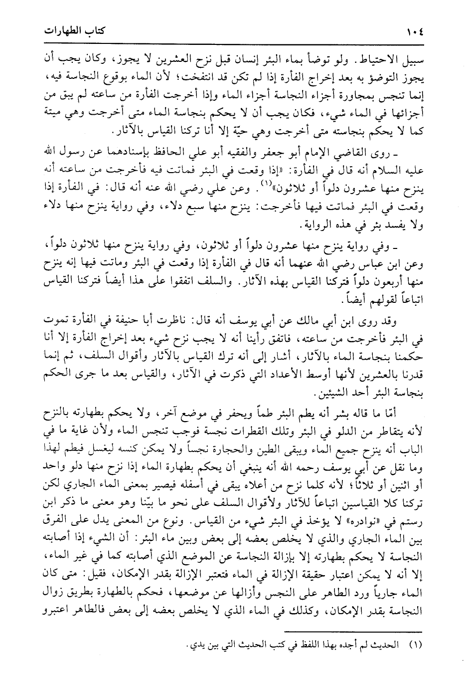 وقد روى ابن أبي مالك عن أبي يوسف أنه قال: ناظرت أبا حنيفة في الفأرة تموت في البئر فأخرجت من ساعته، فاتفق رأينا أنه لا يجب نزح شيء بعد إخراج الفأرة إلا أنا حكمنا بنجاسة الماء بالآثار، أشار إلى أنه ترك القياس بالآثار وأقوال السلف، ثم إنما قدرنا بالعشرين لأنها أوسط الأعداد التي ذكرت في الآثار، والقياس بعد ما جرى الحكم بنجاسة البئر أحد الشيئين.