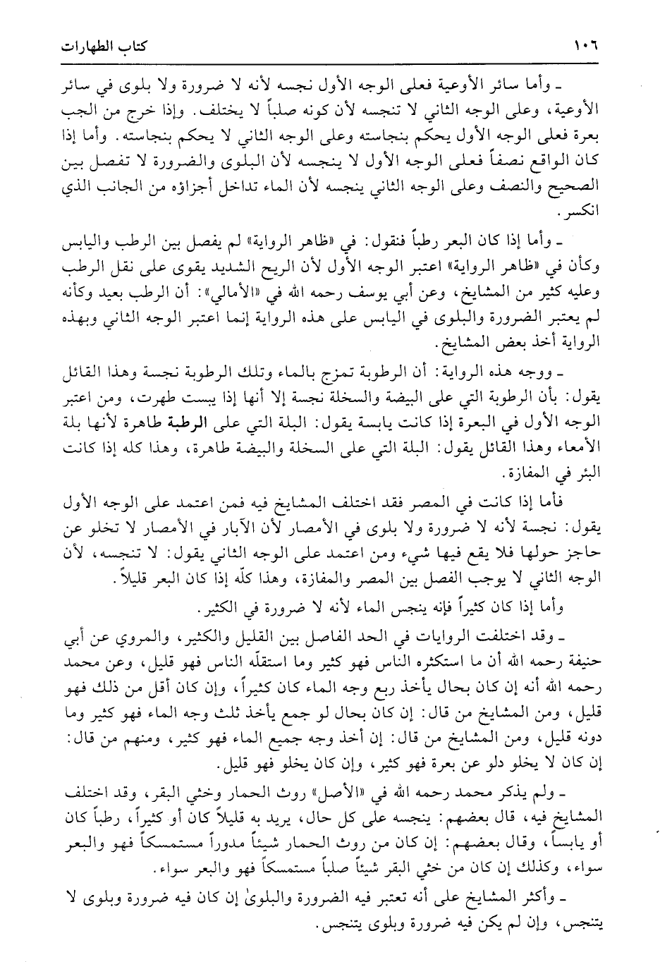 وأما إذا كان البعر رطباً فنقول: في «ظاهر الرواية» لم يفصل بين الرطب واليابس وكأن في «ظاهر الرواية» اعتبر الوجه الأول لأن الريح الشديد يقوى على نقل الرطب وعليه كثير من المشايخ، وعن أبي يوسف رحمه الله في «الأمالي» : أن الرطب بعيد وكأنه لم يعتبر الضرورة والبلوى في اليابس على هذه الرواية إنما اعتبر الوجه الثاني وبهذه الرواية أخذ بعض المشايخ.